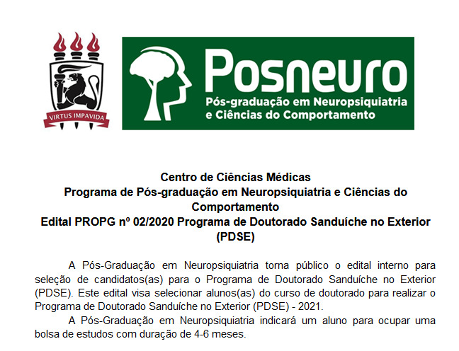 A Pós-Graduação em Neuropsiquiatria torna público o edital interno para seleção de candidatos(as) para o Programa de Doutorado Sanduíche no Exterior (PDSE). Este edital visa selecionar alunos(as) do curso de doutorado para realizar o Programa de Doutorado Sanduíche no Exterior (PDSE) - 2021.  Para mais informações clique nos links: Link 1Link 2; Link 3.