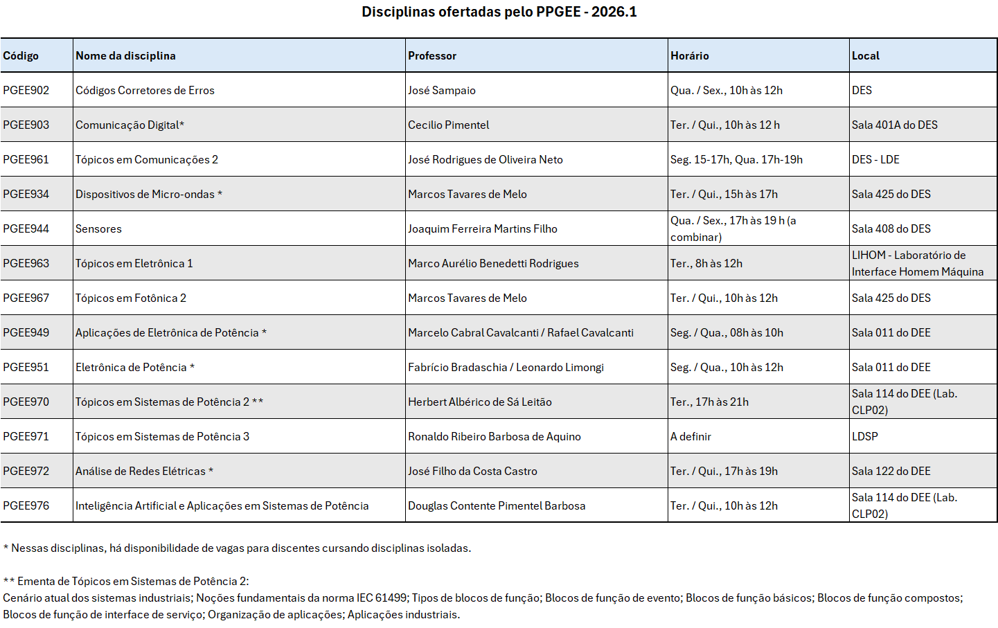 A lista de disciplinas ofertadas para os cursos de mestrado e doutorado do PPGEE no semestre 2026.1 já está disponível, incluindo os respectivos dias e horários de aula.