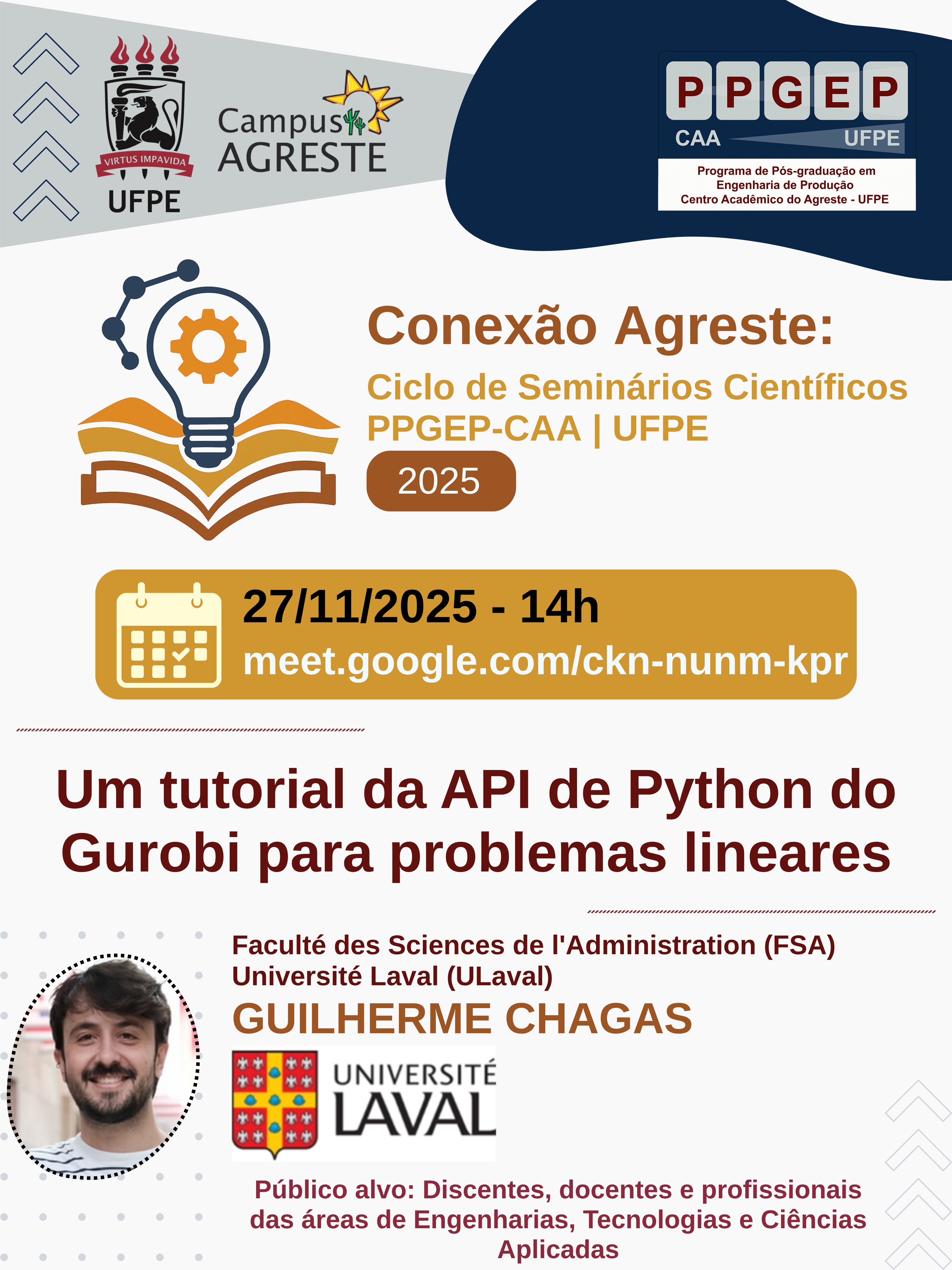 O Programa de Pós-Graduação em Engenharia de Produção – PPGEP-CAA/UFPE convida toda a comunidade acadêmica para o Ciclo de Seminários Científicos – Conexão Agreste 2025, que integra as ações de formação acadêmica e científica do Programa.