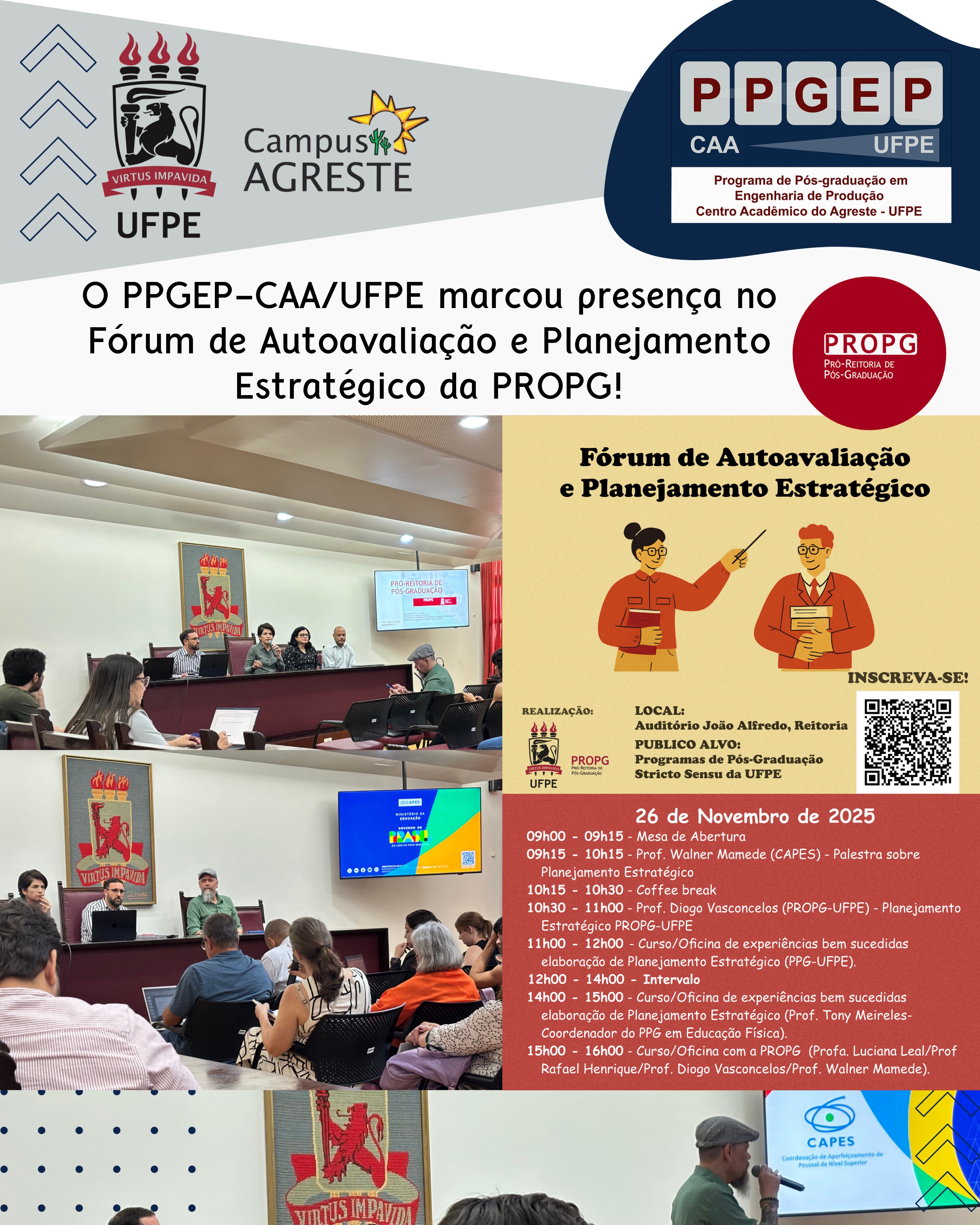 O Programa de Pós-Graduação em Engenharia de Produção – PPGEP-CAA/UFPE participou, no dia 26 de novembro de 2025, do Fórum de Autoavaliação e Planejamento Estratégico, evento promovido pela Pró-Reitoria de Pós-Graduação (PROPG/UFPE) com a presença de diversos Programas de Pós-Graduação stricto sensu da Universidade.