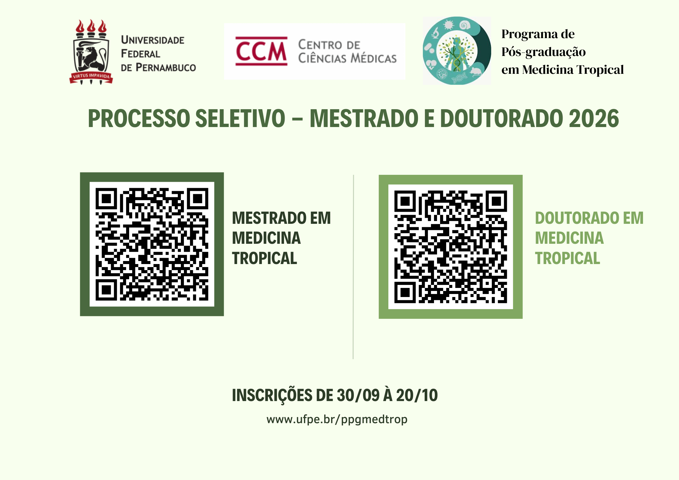 The UFPE Graduate Program in Tropical Medicine has released a public selection notice for those interested in joining the master's and doctorate courses for the 2017 academic year. Entries must be made at the postgraduate office from September 19 to November 1, Monday through Friday, from 8 am to 12 noon and from 2 pm to 5 pm, either personally or by proxy.
