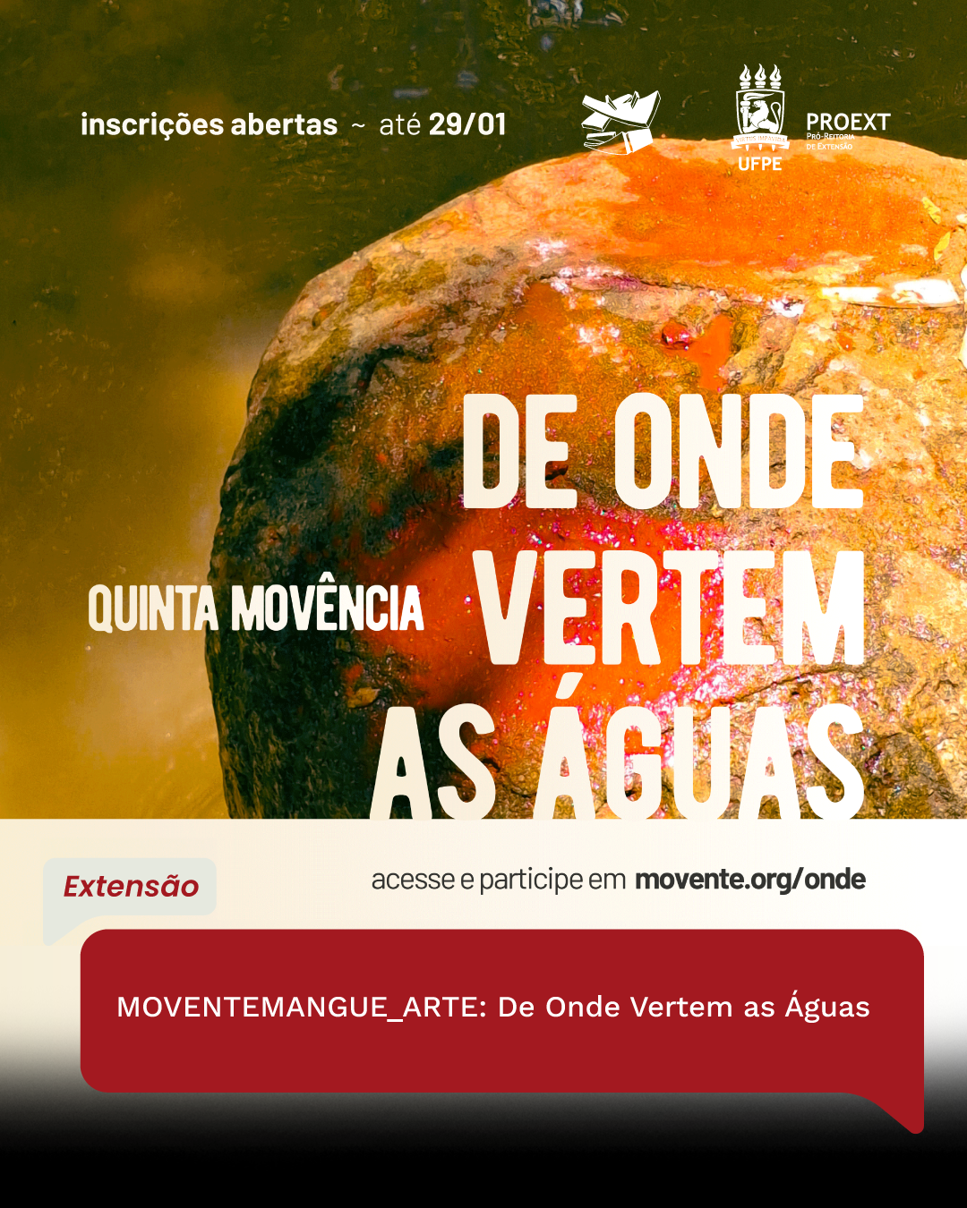 Em novembro de 2025, o projeto de extensão MOVENTEMANGUE_ARTE, vinculado ao curso de Artes Visuais da Universidade Federal de Pernambuco (UFPE), anunciou a abertura da chamada pública para sua 5ª Movência, intitulada “De Onde Vertem as Águas”, com inscrições abertas até o dia 29 de janeiro de 2026. Coordenado pelas professoras Renata Wilner e Joana D’arc Lima, o projeto conta com uma equipe interdisciplinar formada por bolsistas e voluntários(as) de diferentes áreas da universidade, visando ultrapassar os limites acadêmicos e fomentar a circulação da arte nordestina em espaços de educação, cultura e formação crítica.