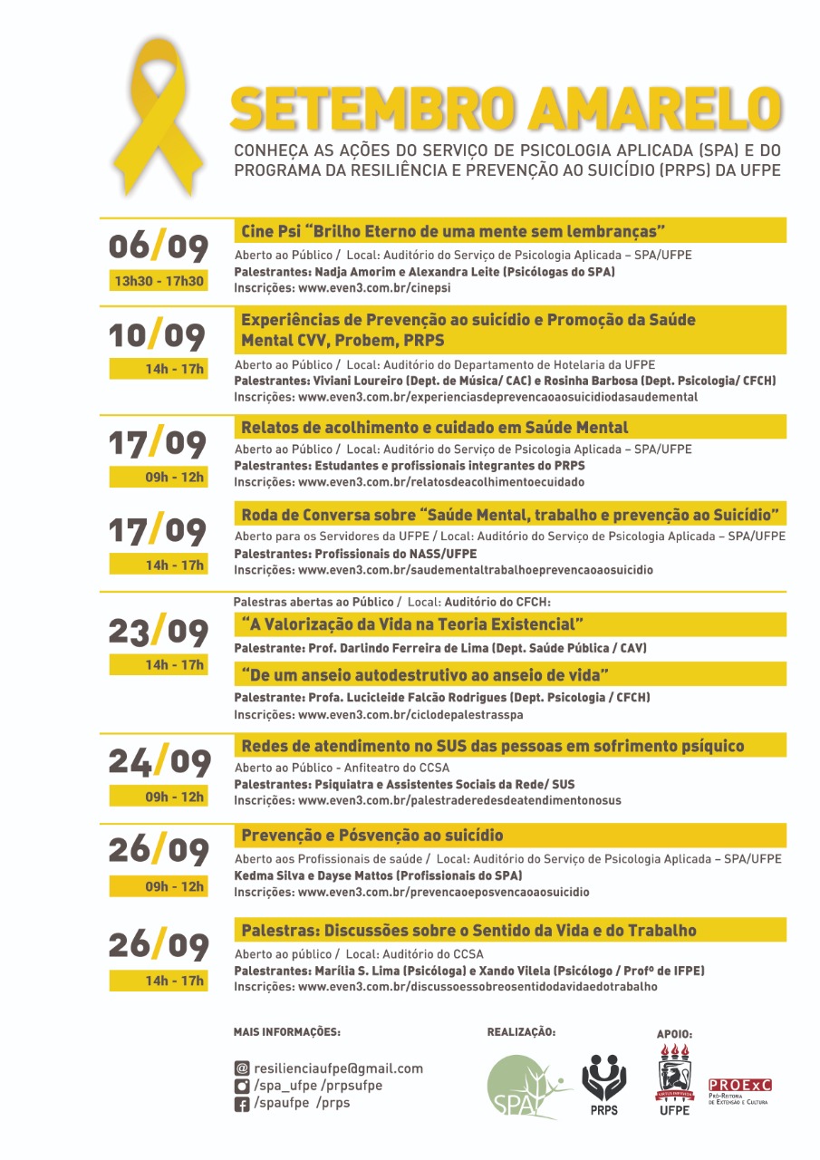 Pensando na importância dessa iniciativa, o Serviço de Psicologia Aplicada (SPA) e o Programa de Resiliência e Prevenção ao Suicídio (PRPS) da UFPE preparou uma programação de ações que irão acontecer no campus neste mês de setembro. Confira abaixo a programação: