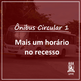 A Coordenação de Transportes da Superintendência de Infraestrutura (Sinfra) informa que houve alteração no funcionamento do ônibus circular durante o recesso acadêmico da Universidade Federal de Pernambuco (UFPE), iniciado na última segunda-feira (8). Foi acrescentado um novo horário, às 12h10, no roteiro do Circular 1 (Casa Feminina/via Caxangá) já divulgado anteriormente, devido à demanda de passageiros no horário do almoço.