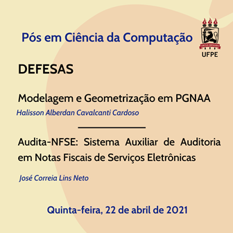 O Programa de Pós-Graduação em Ciência da Computação, vinculado ao Centro de Informática (CIn) da Universidade Federal de Pernambuco (UFPE), promove duas defesas nesta quinta-feira (22), ambas às 13h. A tese intitulada “Modelagem e Geometrização em PGNAA” foi escrito Halisson Alberdan Cavalcanti Cardoso, foi orientada pelo professor Silvio de Barros Melo e coorientado pelo professor Ricardo Martins de Abreu e Silva. A defesa será realizada às 13h, de forma virtual, e os interessados em assistir entrar em contato com o aluno através do e-mail hacc@cin.ufpe.br.