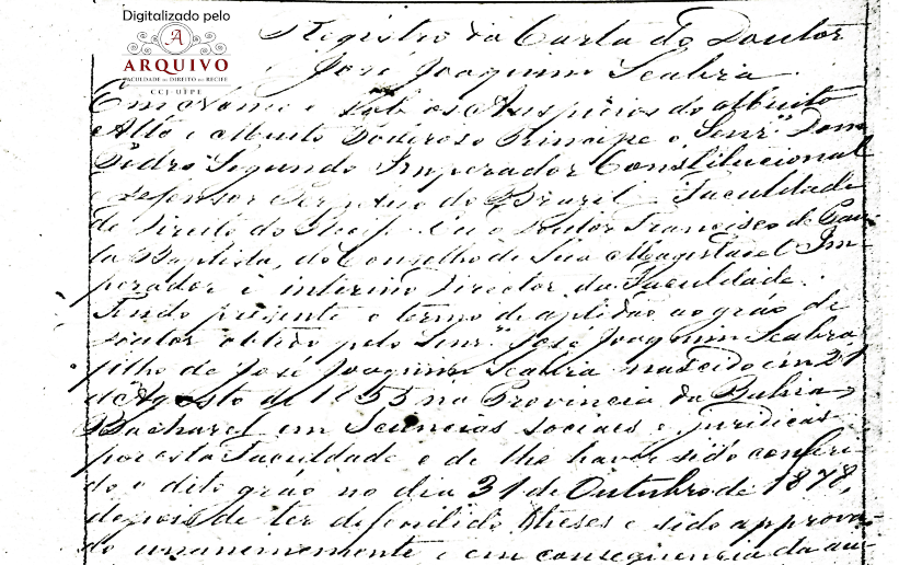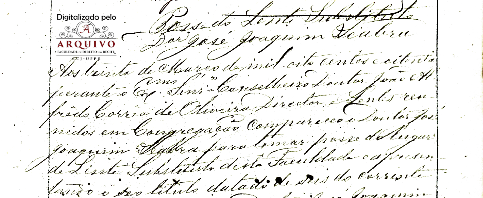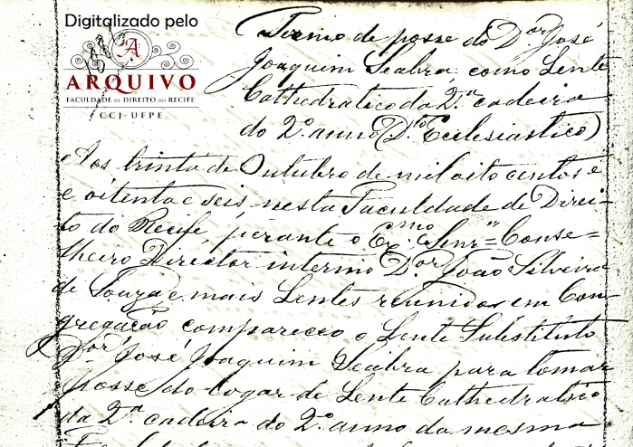 Aos 31 anos de idade, no dia 30 de outubro de 1886, nesta Faculdade de Direito do Recife, perante o Exmo. Senhor Conselheiro Diretor interino Dr. João Silveira de Souza e mais Lentes reunidos em congregação, compareceu o Lente Substituto Dr. José Joaquim Seabra para tomar posse do lugar de Lente Catedrático da 2ª cadeira do 2º ano da mesma faculdade, vaga pelo falecimento do Dr. Graciliano de Paula Baptista e apresentando o respectivo Título do Decreto Imperial datado de 25 de setembro de 1886, pelo qual foi nomeado para sobre dito lugar.