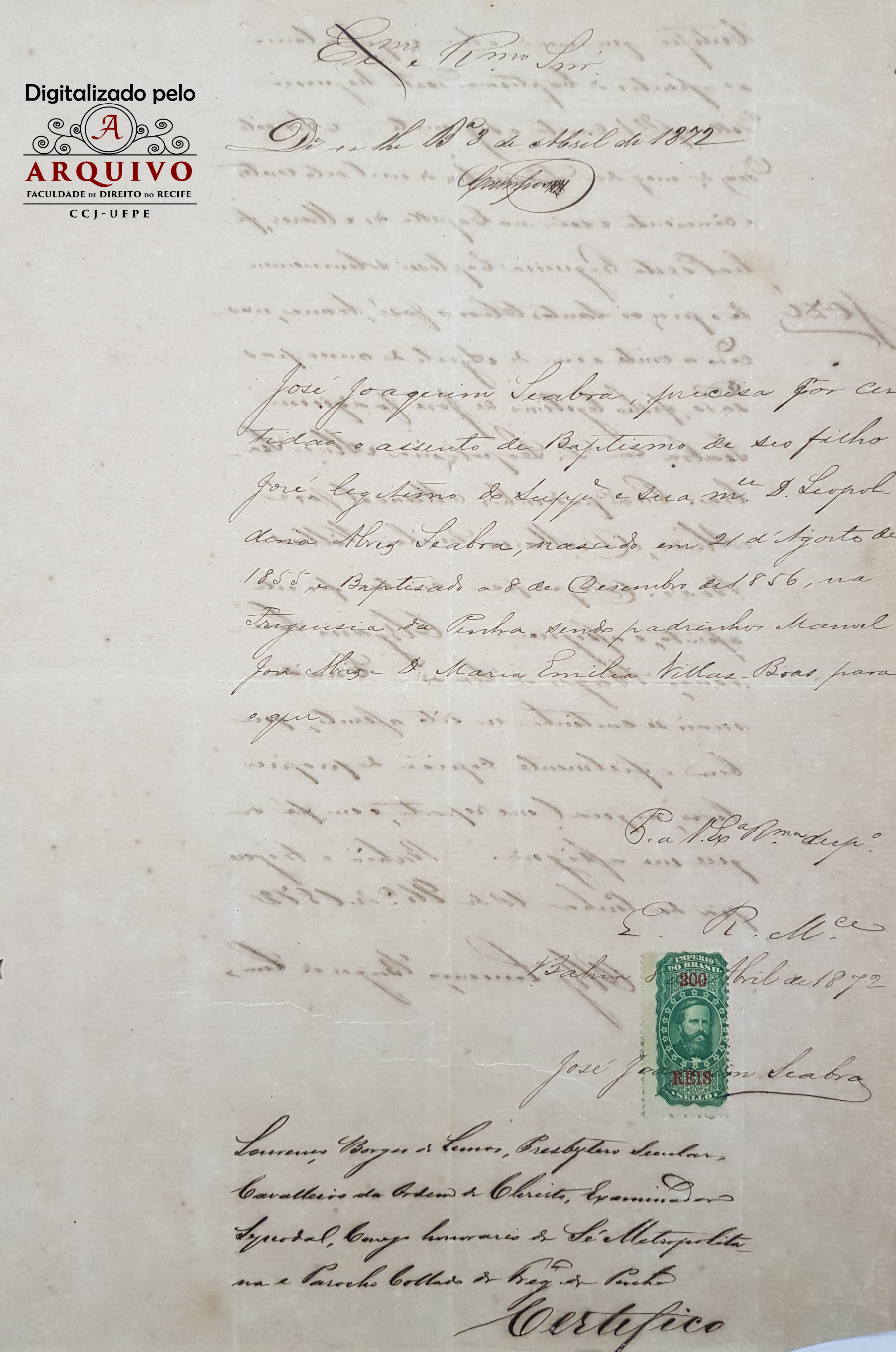 De acordo com a certidão de idade de 1873 do aluno José Joaquim Seabra Júnior, consta a seguinte informação: Lourenço Borges de Lemos Presbítero Seculares Cavalheiro da Ordem de Cristo, Examinador Episcopal, cônego honorário da Sé Metropolitana e Pároco Colado da Freguesia da Penha. Certifico que revendo o livro em que se lação os assentos de batismos desta freguesia, dele folha 92 v, consta o seguinte: Aos 08 de dezembro de 1856 na Capela dos Mares, filial desta freguesia batizei solenemente e pus santo Óleos a José, branco, nascido a 21 de agosto de 1855, filho legítimo de José Joaquim Seabra com D. Leopoldina Alves Seabra. Foram padrinhos Manoel José Alves e D. Maria Emília Villas-Boas.