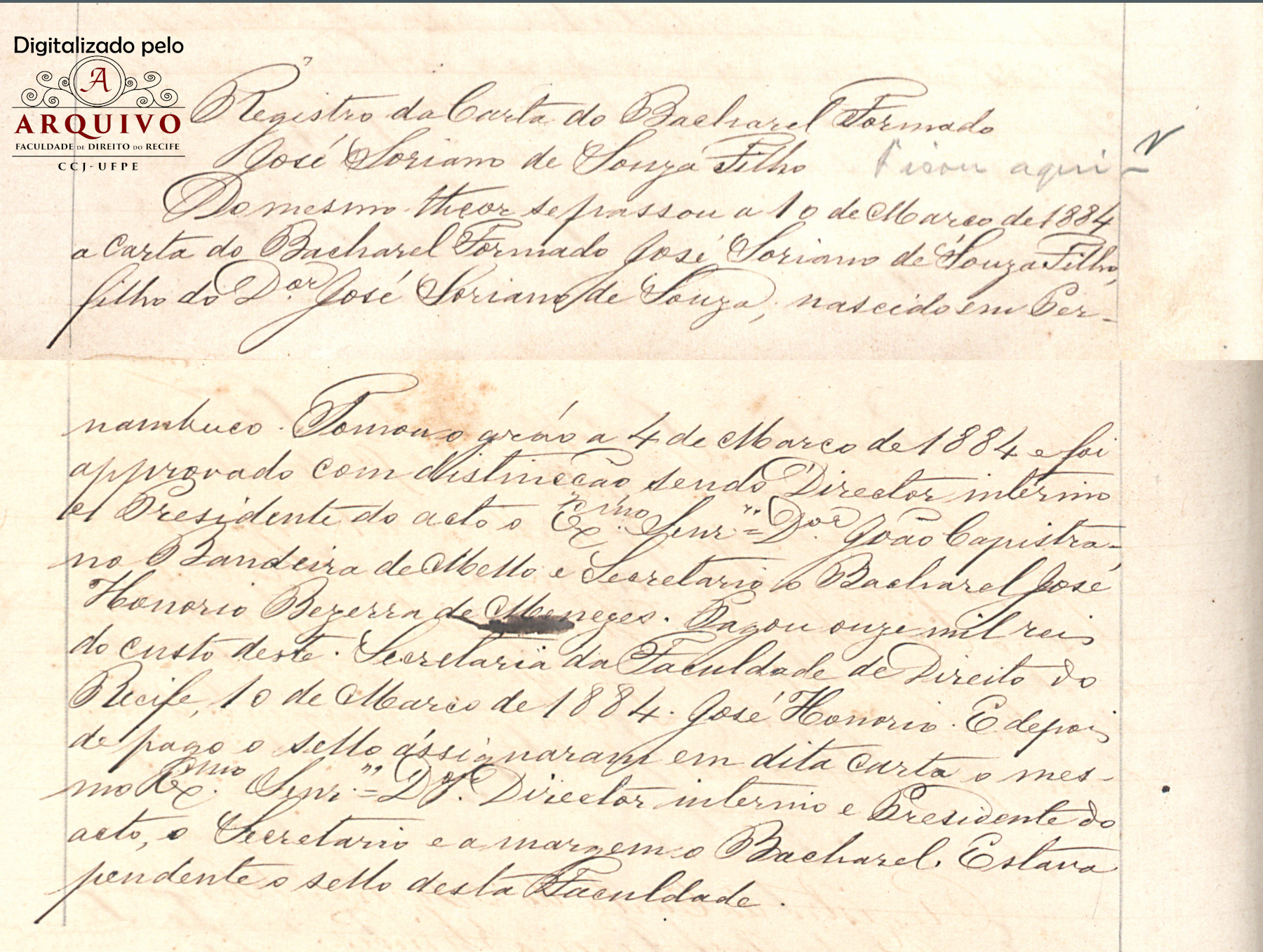 Conforme consta na Lista geral dos estudantes matriculados na Faculdade de Direito do Recife, ingressou no curso de Ciências Jurídicas e Sociais na Faculdade de Direito do Recife – em 1881. No ano seguinte, quem se matriculou também na Faculdade de Direito do Recife foi seu irmão Thomaz Soriano de Souza. Recebeu o grau de Bacharel em Ciências Jurídicas e Sociais, em 04 de março de 1884 e foi aprovado com distinção – como segue a imagem abaixo: