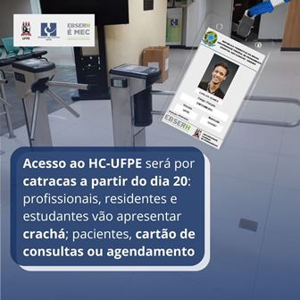 A partir do dia 20 deste mês, o acesso de toda a comunidade ao Hospital das Clínicas da UFPE acontecerá por meio de catracas nas portarias e a devida identificação da pessoa. Profissionais, residentes e estudantes vão apresentar o crachá de identificação, enquanto os pacientes terão de mostrar o cartão de controle de consultas ou agendamento (sendo permitido o acesso de um acompanhante nos casos legalmente previstos). Essas são algumas das medidas de ampliação da segurança no HC, unidade vinculada à Empresa Brasileira de Serviços Hospitalares (Ebserh).Desde ontem (2), a Divisão de Gestão de Pessoas do hospital já começou a entregar o primeiro lote dos crachás físicos para os colaboradores que realizaram suas solicitações no início do prazo – mais crachás ainda chegarão. Os estudantes com atividades no HC e residentes também estão recebendo o crachá virtual em formato pdf enviado pela Gerência de Ensino e Pesquisa.