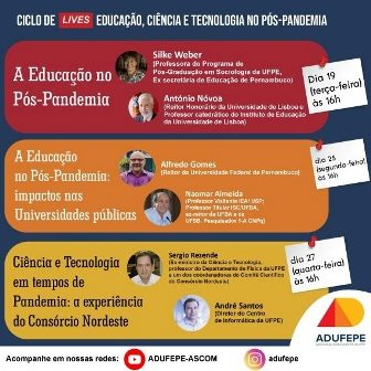 No dia 27 deste mês, também às 16h, a Adufepe realizará o terceiro momento do Ciclo das Lives. Sérgio Rezende, ex-ministro da Ciência e Tecnologia, professor do Departamento de Física da UFPE e um dos coordenadores do Comitê Científico do Consórcio Nordeste, e André Santos, diretor do Centro de Informática da UFPE, falarão sobre “Ciência e Tecnologia em tempos de pandemia: a experiência do Consórcio Nordeste”.
