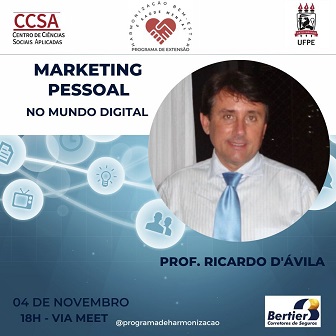 No dia 4 de novembro, às 18h, o Programa de Harmonização, Bem-Estar e Saúde Mental do Centro de Ciências Sociais Aplicadas (CCSA) promove live com o professor Ricardo D’Ávila sobre o tema “Marketing Pessoal no Mundo Digital”. As inscrições para participar do evento on-line podem ser feitas aqui.