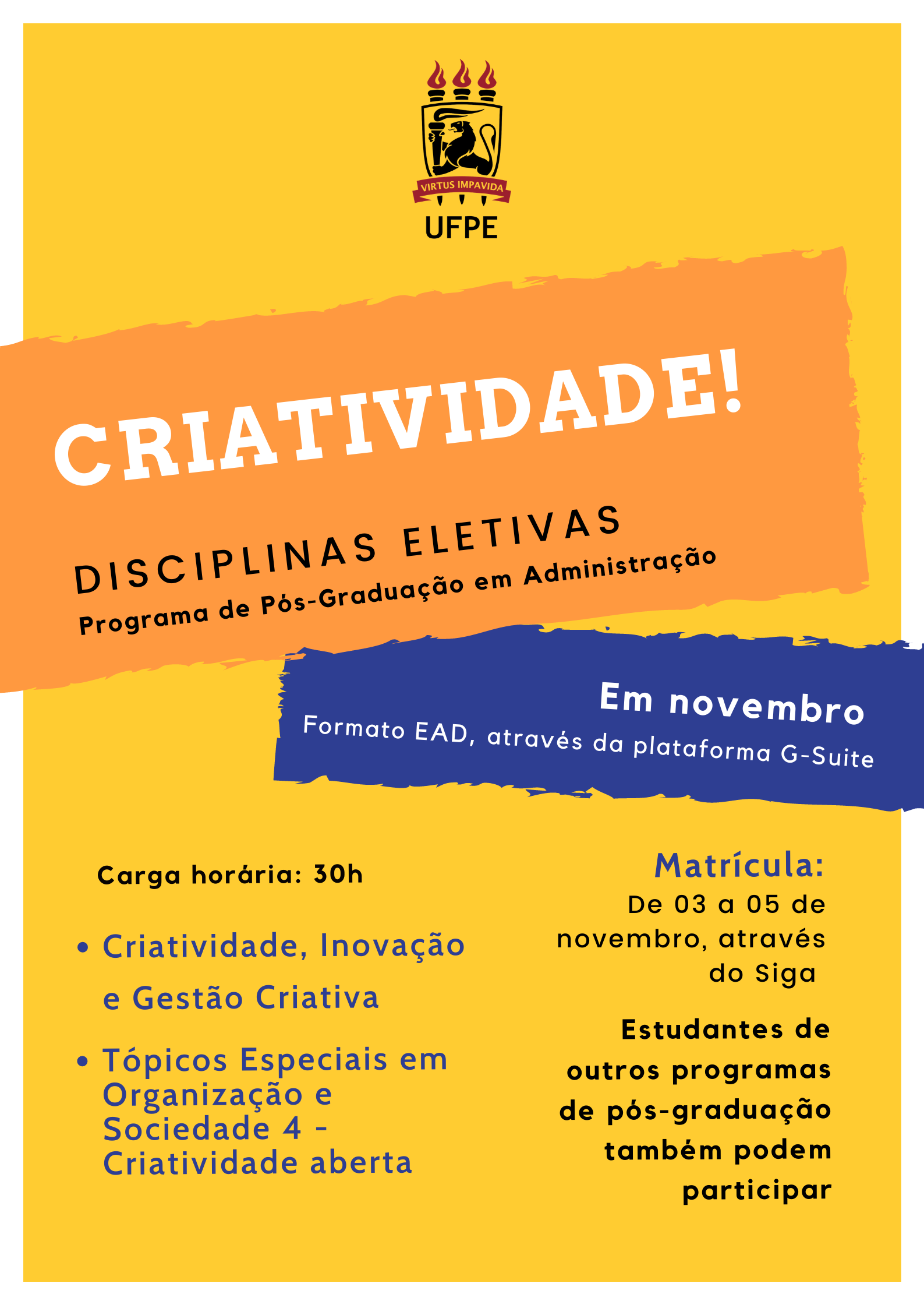- Pós em Administração oferta duas disciplinas de Criatividade para o período 2020.2