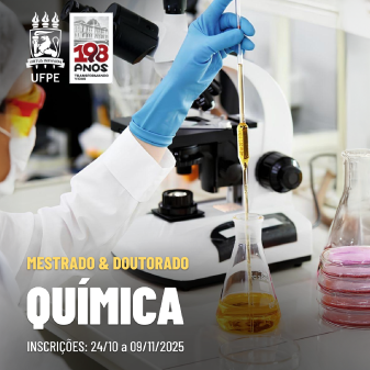 O Programa de Pós-Graduação em Química (PPGEQ) da Universidade Federal de Pernambuco (UFPE) está com inscrições abertas para o processo seletivo de ingresso nos cursos de Mestrado e Doutorado acadêmico. Os interessados devem se inscrever, até o dia 9 de novembro, por meio do portal do Sigaa.