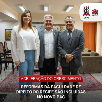 A UFPE comemora a inclusão da reforma das estruturas acadêmicas e administrativas da Faculdade de Direito do Recife (FDR)/Centro de Ciências Jurídicas no Novo Programa de Aceleração do Crescimento (Novo PAC), programa de investimentos coordenado pelo governo federal, que tem o objetivo de acelerar o crescimento econômico e promover a inclusão social. Serão destinados, num primeiro momento, R$ 16 milhões para o projeto de restauração do prédio histórico, construído em 1912.