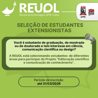 A Revista de Enfermagem UFPE On-line (Reuol) está com inscrições abertas, até o dia 31 de março, para a seleção de estudantes voluntários interessados em participar do projeto de extensão “Editoração científica e comunicação do conhecimento”. Os interessados devem se inscrever por meio do preenchimento de formulário eletrônico. As vagas são limitadas.