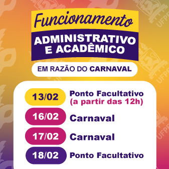 A Universidade Federal de Pernambuco, por meio da Pró-Reitoria de Gestão de Pessoas e Qualidade de Vida (Progepe), informa o funcionamento administrativo e acadêmico durante o período de Carnaval: