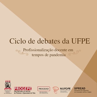 A Pró-Reitoria de Gestão de Pessoas e Qualidade de Vida (Progepe) e a Pró-Reitoria de Graduação (Prograd) da Universidade Federal de Pernambuco (UFPE), em parceria com o Núcleo de Formação Docente (Nufope) e a Secretaria de Programas em Educação Aberta e a Distância (Spread), promovem o Ciclo de Debates da UFPE – Profissionalização Docente em Tempos de Pandemia. Podem participar todos os servidores, sejam docentes ou técnicos. Será aberto e gravado, para ser disponibilizado no YouTube da UFPE.