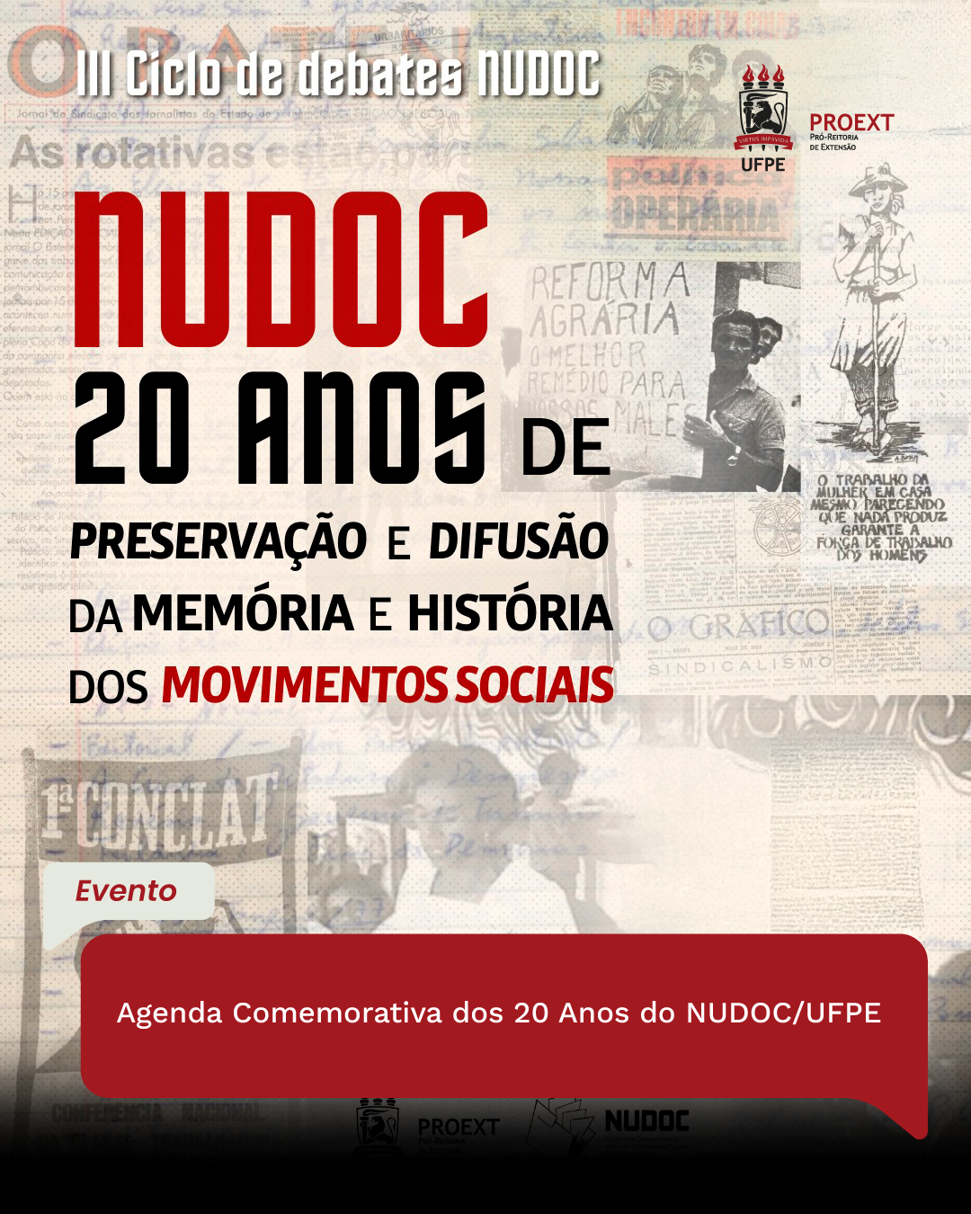 Em 2025, o NUDOC celebra seus 20 anos de atuação com uma programação especial que homenageia sua trajetória (seus fundadores, parceiros e todas as pessoas que contribuíram para consolidar esse espaço de memória e extensão universitária.