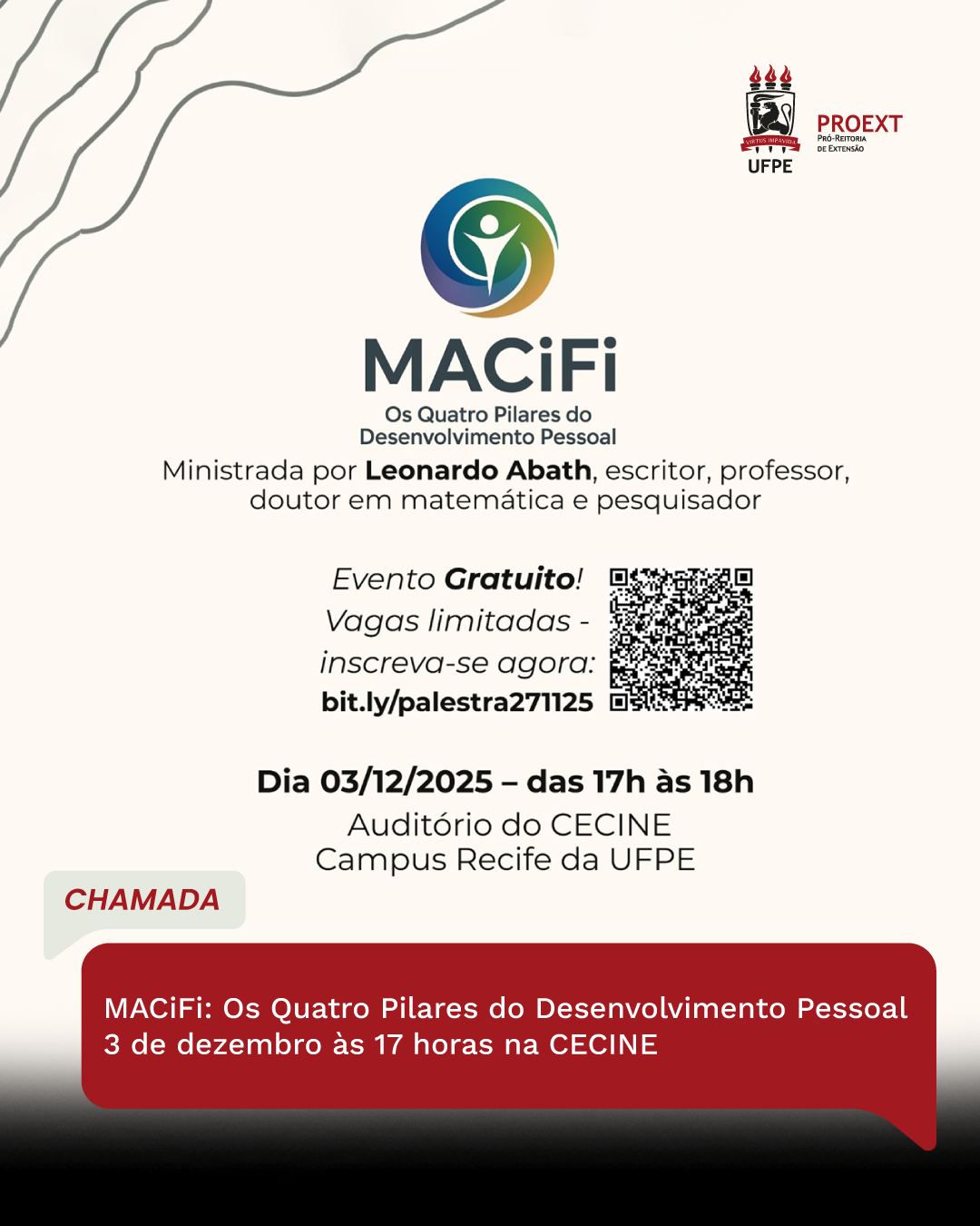 A Universidade Federal de Pernambuco (UFPE) realizará, no dia 3 de dezembro de 2025, às 17 horas na CECINE, o evento MACiFi: Os Quatro Pilares do Desenvolvimento Pessoal, que apresentará a metodologia desenvolvida pelo escritor, professor, pesquisador e doutor em Matemática Leonardo Abath. A iniciativa reunirá estudantes, servidores, docentes e interessados em práticas contemporâneas de desenvolvimento humano, propondo reflexões sobre ciência, arte e propósito como caminhos integrados de autotransformação.