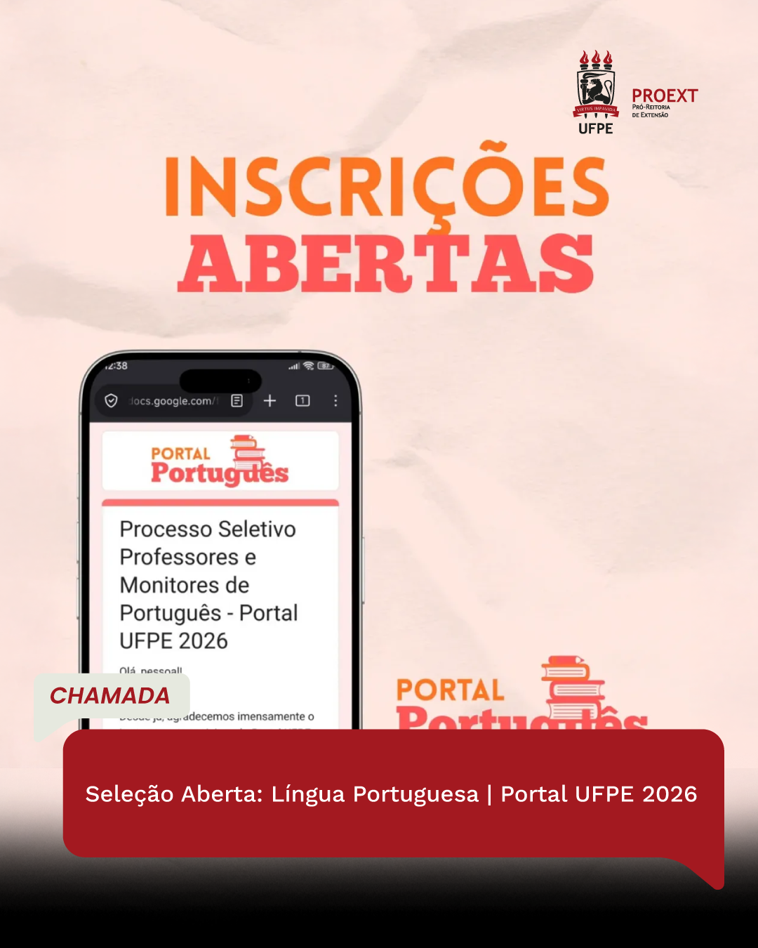 Estão abertas as inscrições para o processo seletivo de professores(as) e monitores(as) voluntários(as) da disciplina de Língua Portuguesa do Portal UFPE, um dos pré-acadêmicos da Universidade Federal de Pernambuco. Em atuação desde 2003, o Portal é voltado à capacitação de estudantes e egressos do ensino médio da rede pública para exames como o ENEM e o SSA.