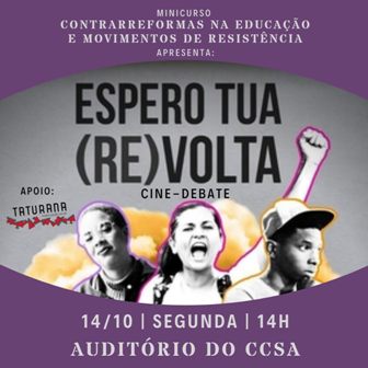 A organização do “Minicurso: contrarreformas na educação e movimentos de resistência” exibirá, no dia 14 deste mês, como atividade de encerramento do minicurso, o filme “Espero tua (re) volta)”, dirigido por Elisa Capai e premiado no Festival de Berlim e no Cine-PE. Após a exibição, acontecerá um debate com Maria Katarina Bezerra Cruz da Silva (ex-ocupante da Erem Cândido Duarte), Victória Pinheiro (diretora da UNE) e Soraia de Carvalho (professora do Departamento de Serviço Social da UFPE). O evento será no auditório do Centro de Ciências Sociais Aplicadas (CCSA), a partir das 14h.