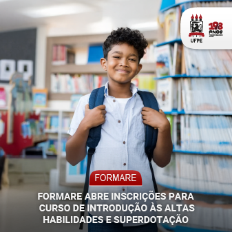 A UFPE, por meio da Escola de Formação dos Servidores (Formare), divulga a abertura das inscrições para o curso “Altas Habilidades/Superdotação”. A ação formativa se destina a  servidores das diversas áreas da Universidade. As inscrições vão até as 12h do dia 6 de março, por meio deste link.