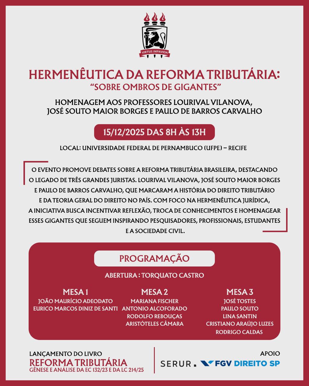 A Faculdade de Direito do Recife (FDR/UFPE) sediará, no dia 15 de dezembro de 2025, das 8h às 13h, o evento “Hermenêutica da Reforma Tributária: Sobre Ombros de Gigantes”, uma homenagem aos professores Lourival Vilanova, José Souto Maior Borges e Paulo de Barros Carvalho, juristas que marcaram de forma decisiva a história do Direito Tributário brasileiro.