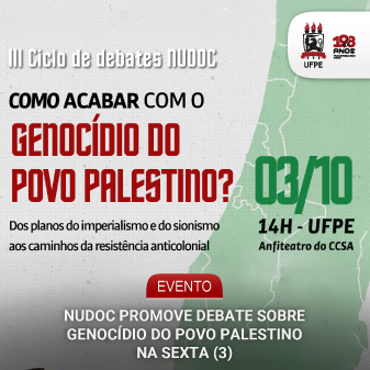 O Núcleo de Documentação sobre os Movimentos Sociais de Pernambuco Dênis Bernardes (Nudoc) da UFPE promove o debate “Como acabar com o genocídio do povo palestino?”. O encontro, que dá início ao III Ciclo de Debates Nudoc, ocorre nesta sexta-feira (3), às 14h, no anfiteatro do Centro de Ciências Sociais Aplicadas (CCSA) da Universidade. Inscrições pelo link.