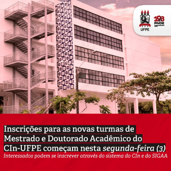 O Programa de Pós-Graduação em Ciências da Computação, do Centro de Informática (CIn) da UFPE, torna público o edital de seleção para as novas turmas do Mestrado e Doutorado Acadêmico. As inscrições estão abertas e podem ser feitas até 25 de novembro, por meio do preenchimento, obrigatório, de duas fichas on-line, presentes no Sigaa e no Sistema CIn.