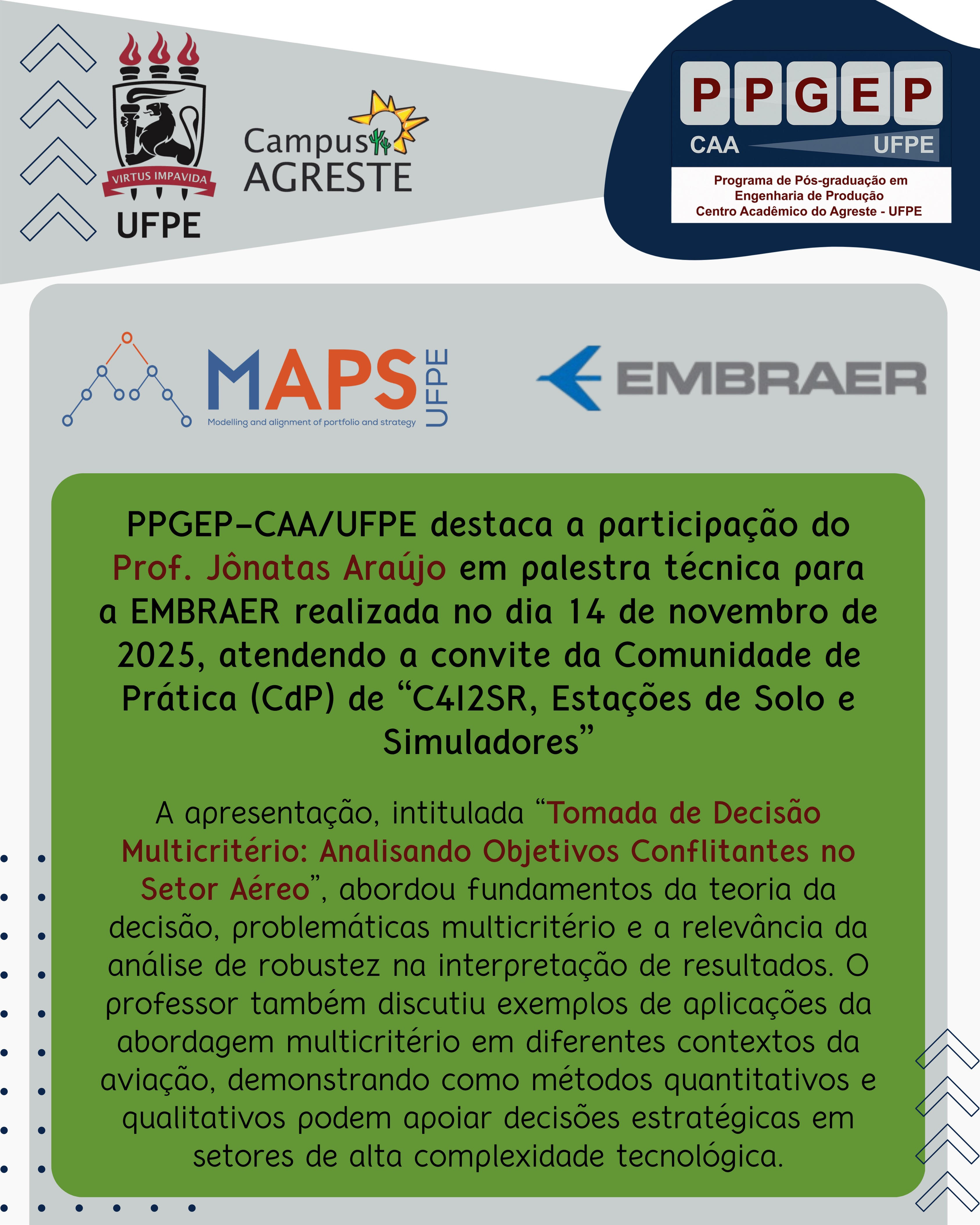 O Programa de Pós-Graduação em Engenharia de Produção – PPGEP-CAA/UFPE, Campus do Agreste – Caruaru/PE, registra com satisfação a participação do Prof. Dr. Jônatas Araújo de Almeida em uma palestra técnica realizada no dia 14 de novembro de 2025, atendendo a convite da Comunidade de Prática (CdP) de “C4I2SR, Estações de Solo e Simuladores” da EMBRAER S.A.