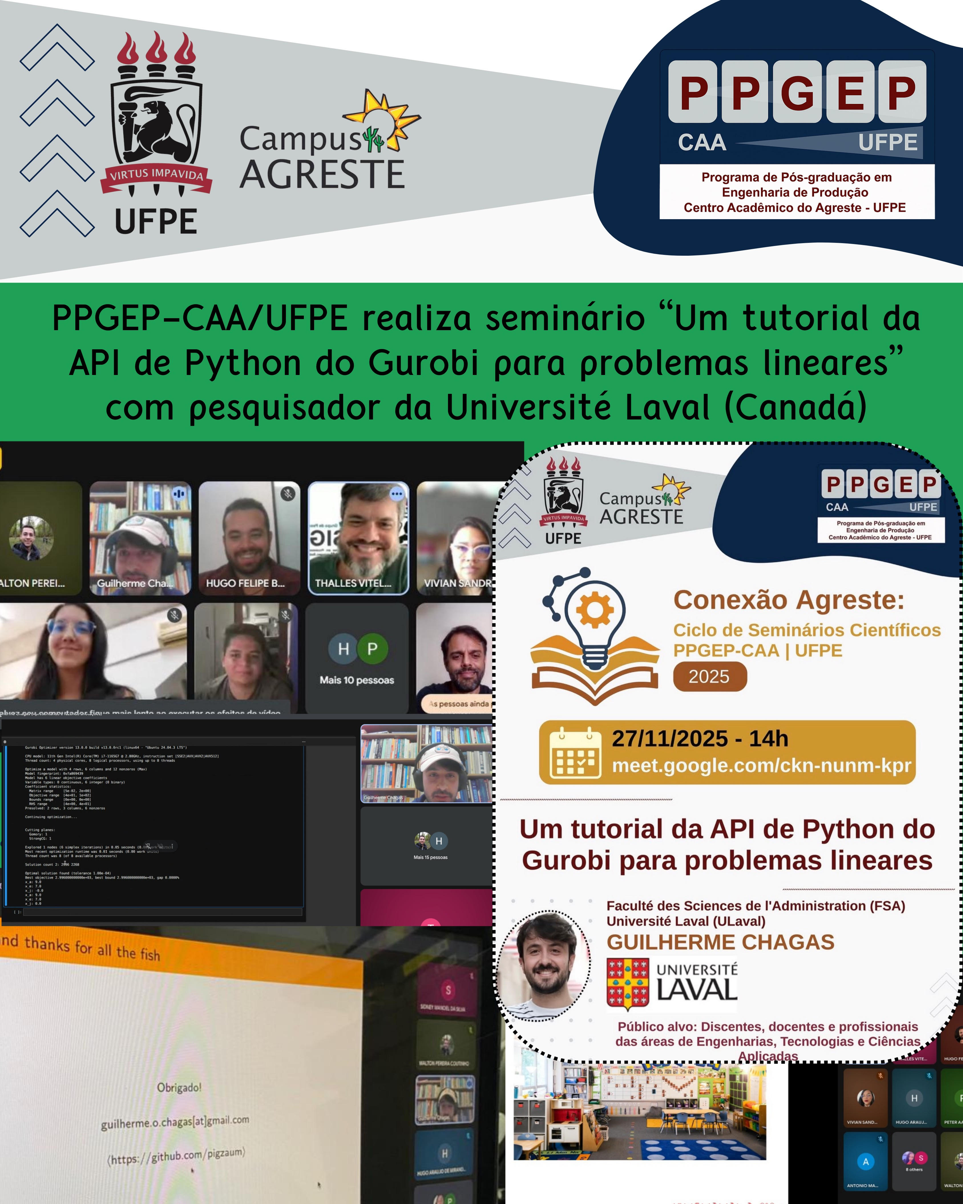O seminário, transmitido às 14h, apresentou a palestra “Um tutorial da API de Python do Gurobi para problemas lineares”, conduzida por Guilherme Chagas, pesquisador da Faculté des Sciences de l’Administration (FSA), Université Laval (ULaval), Canadá.