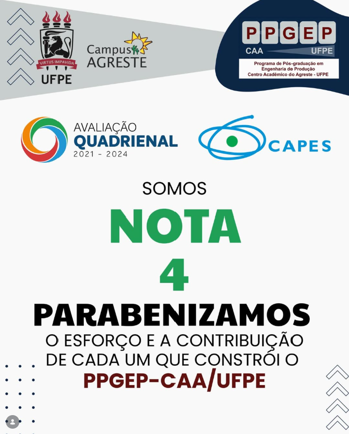 O Programa de Pós-Graduação em Engenharia de Produção – PPGEP-CAA/UFPE agradece à Universidade Federal de Pernambuco, através da Pró-Reitoria de Pós-Graduação (PROPG), à CAPES (@capes_oficial), ao CNPq (@cnpq_oficial) e à FACEPE (@facepe_oficial) pelo apoio institucional e pelo fomento contínuo às atividades de pesquisa, formação de recursos humanos, fundamentais para o fortalecimento da interiorização da ciência produzida no Campus do Agreste da UFPE.