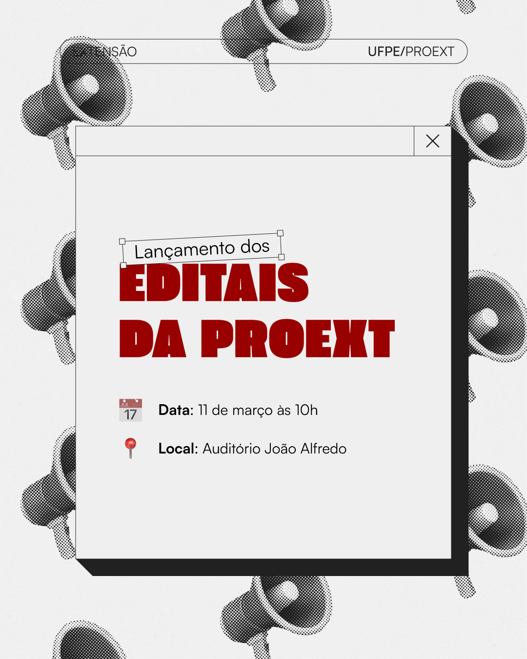 A Pró-Reitoria de Extensão (Proext) da Universidade Federal de Pernambuco realiza, no próximo dia 11 de março, às 10h, o lançamento dos Editais 2026 voltados às ações de extensão universitária. O evento ocorrerá no Auditório João Alfredo, localizado na Reitoria.