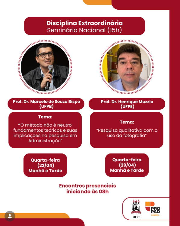 Aproveite esta oportunidade para aprofundar o debate teórico-metodológico no campo da Administração e para conhecer metodologias criativas na pesquisa em administração. Fique atento(a) e participe!