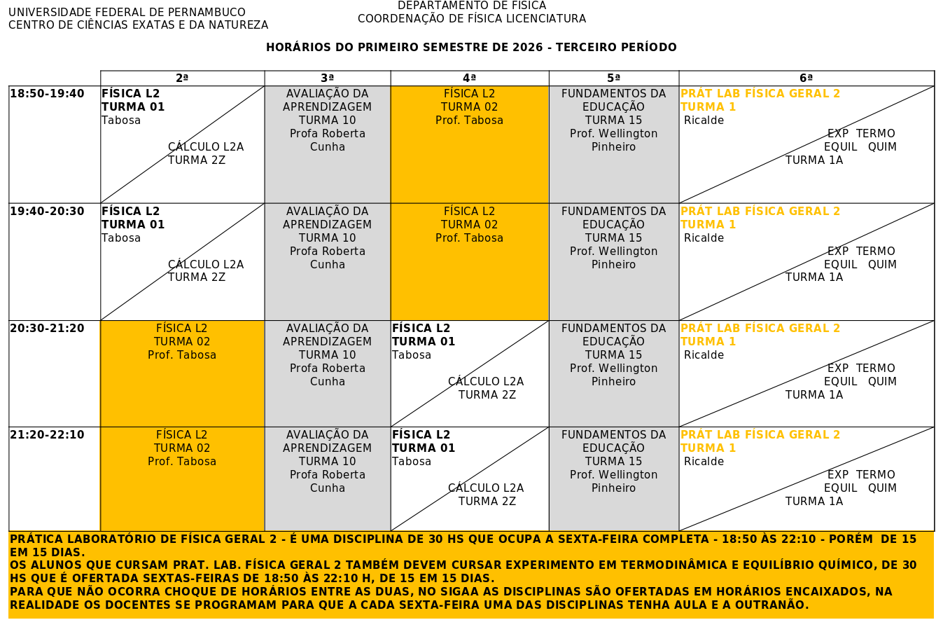 - O curso de Licenciatura em Física oferta no primeiro semestre de cada ano as disciplinas dos semestres ímpares;