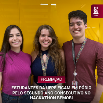 A equipe Munix, composta pelos estudantes Marina Paixão (Expressão Gráfica), Natalie Chaves (Design) e Uanderson Ricardo (Engenharia da Computação) da UFPE, conquistou o 2º lugar entre as 107 equipes inscritas no Hackathon Bemobi, que ocorreu em outubro, durante o evento Hacktudo – Festival de Cultura Digital, no Rio de Janeiro. Essa é a segunda vez dos estudantes na competição. No ano passado, a equipe também participou do Hackathon OLX, através do evento Hacktudo, conquistando o 3° lugar com a solução “OLX 360°”.