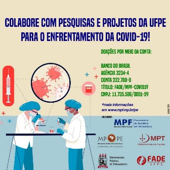Por meio da campanha, a iniciativa privada em Pernambuco é chamada a apoiar plano de ação da UFPE com pesquisas e projetos em desenvolvimento para enfrentamento da pandemia da Covid-19. Empresas e particulares que quiserem se juntar à ação solidária podem fazer suas doações pela seguinte conta bancária: Banco do Brasil, Agência 3234-4, Conta 232.788-0, Título: Fade/ MPF-Covid19, CNPJ: 11.735.586/0001-59.