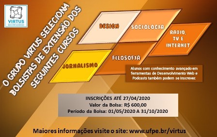O Virtus, grupo de pesquisadores ligados ao Programa de Pós-Graduação em Direitos Humanos da UFPE, seleciona bolsistas para o projeto de extensão Virtus Web: Defesa Social, Segurança Pública e Direitos Humanos. Podem concorrer, estudantes dos cursos de Jornalismo, Design, Sociologia, Filosofia e Rádio, TV e Internet da UFPE. Estudantes de outras graduações também podem se candidatar, desde que dominem as ferramentas de edição e organização de podcasts, bem como os meios digitais de desenvolvimento web.