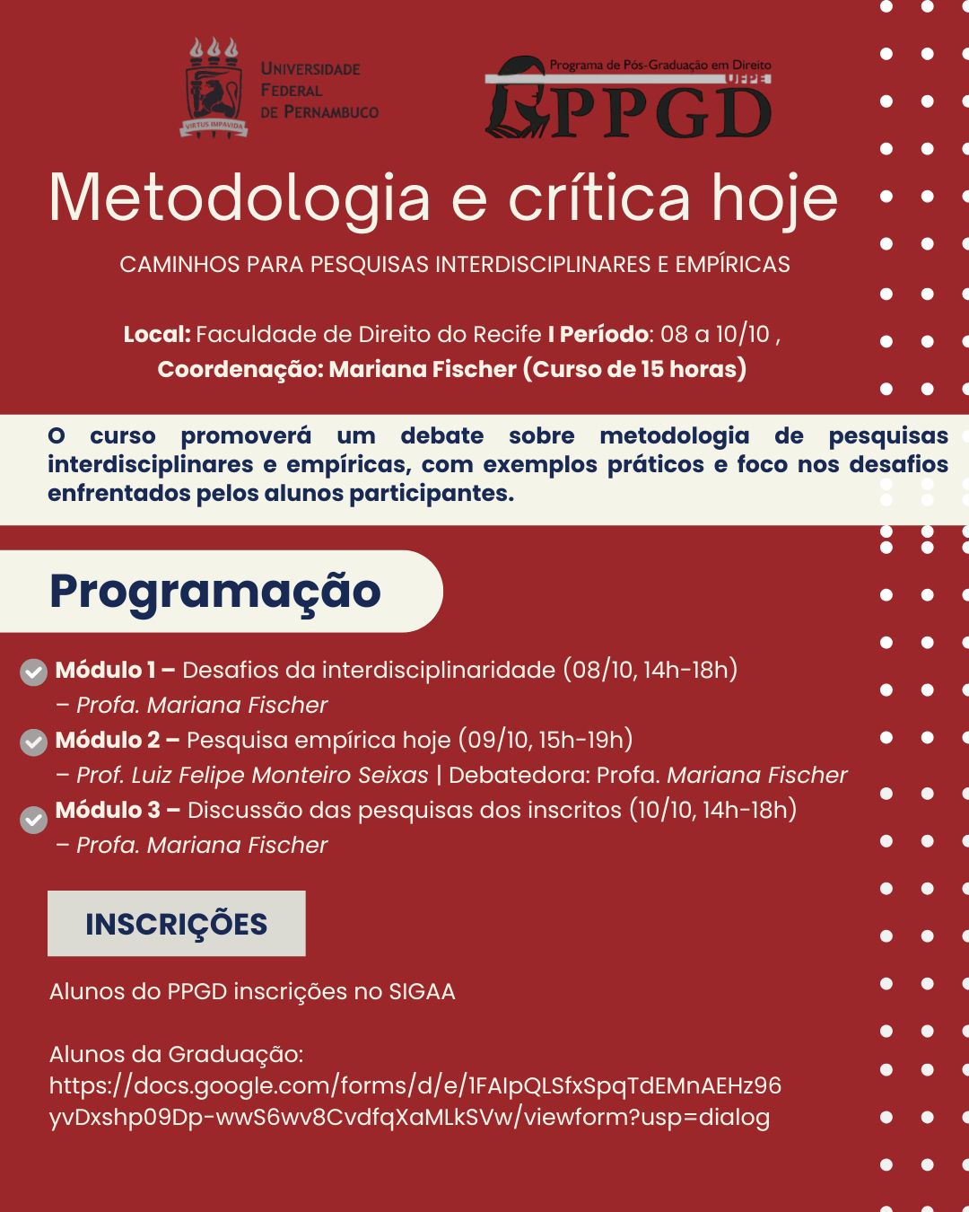 MINICURSO - METODOLOGIA E CRÍTICA HOJE: CAMINHOS PARA PESQUISAS INTERDISCIPLINARES E EMPÍRICAS NO PPGD/UFPE
