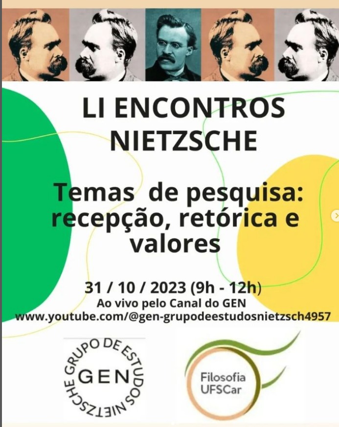 A 51° edição dos Encontros Nietzsche: Temas de pesquisa: recepção, retórica e valores será realizada em 31 outubro, das 9h às 12h, em formato on-line com transmissão ao vivo pelo canal do Grupo de Estudos Nietzsche (GEN) no Youtube