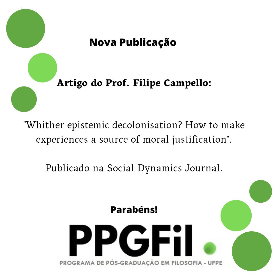 Publicação de um novo artigo intitulado "Whither epistemic decolonisation? How to make experiences a source of moral justification", publicado na Social Dynamics Journal, do Prof. Filipe Campello. O artigo dá continuidade ao projeto de cooperação sul-sul realizado em parceria entre o PPGFil-UFPE e a University of Cape Town, na África do Sul. Segue o link da publicação: https://www.tandfonline.com/ doi/10.1080/02533952.2023. 2234132.