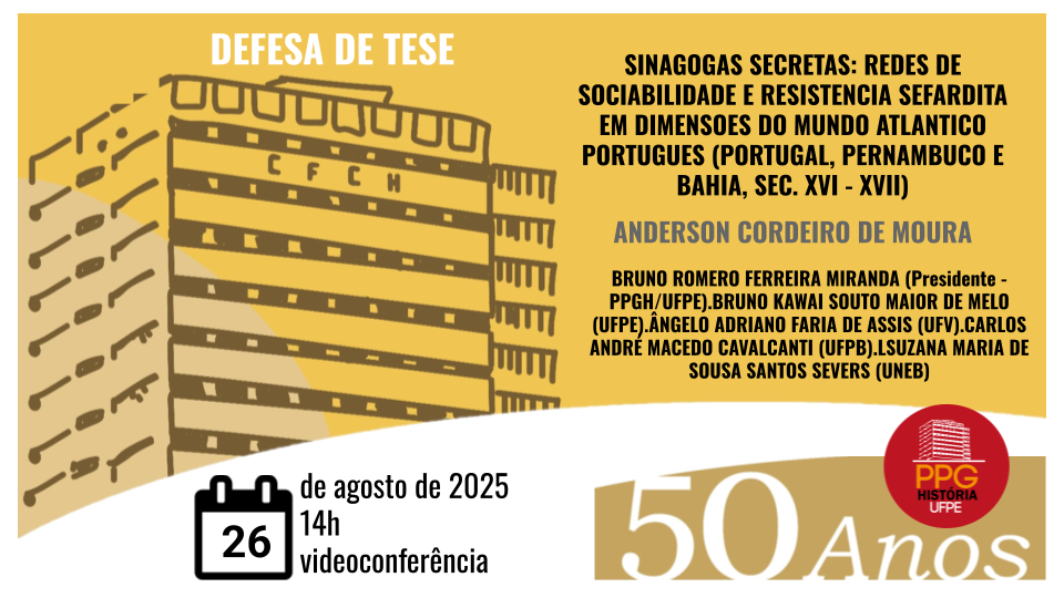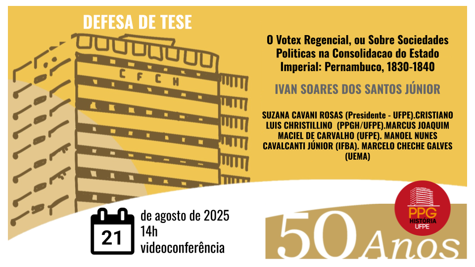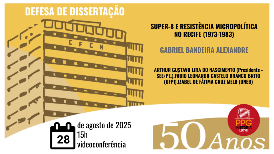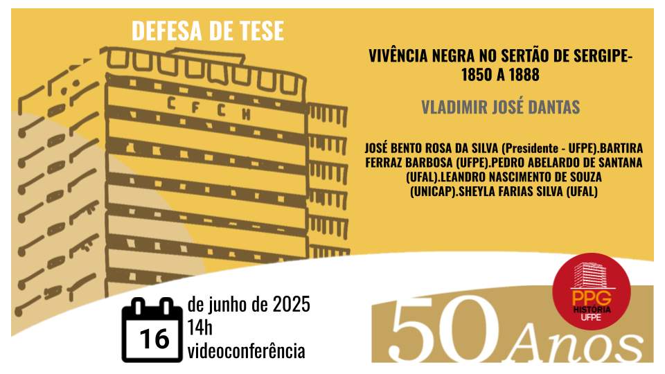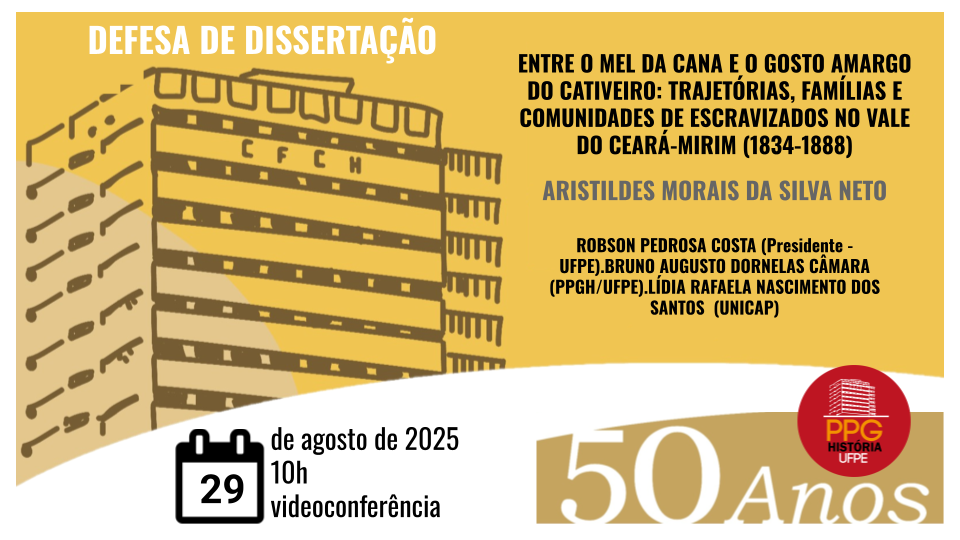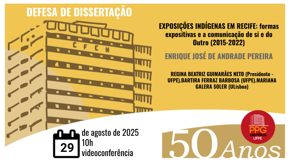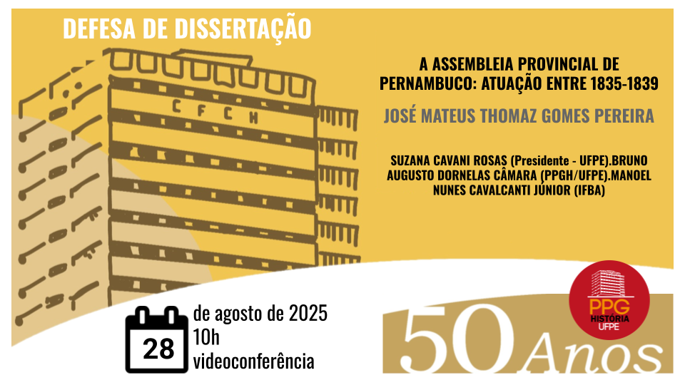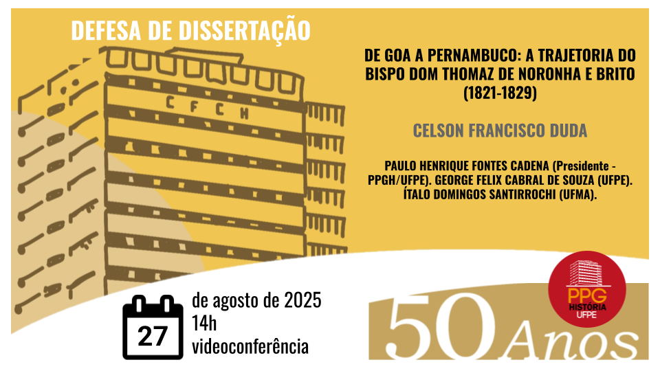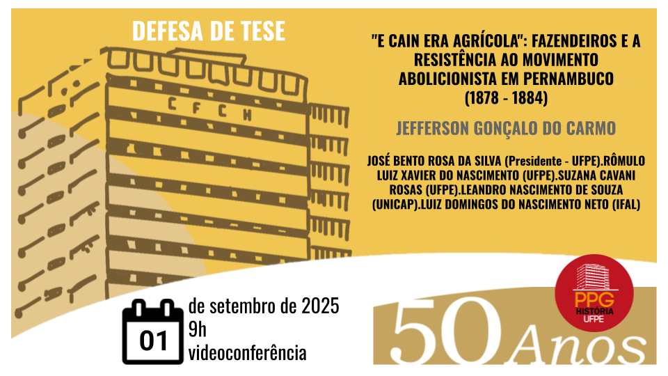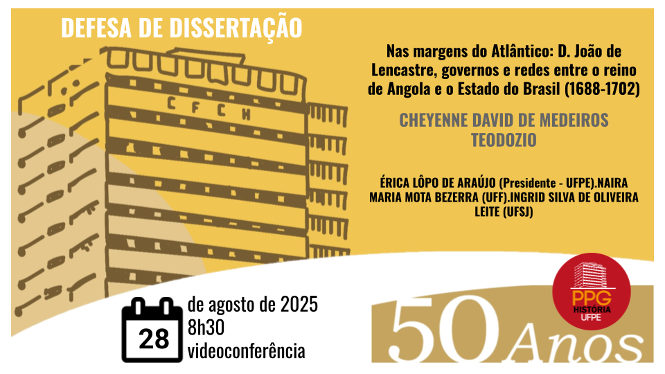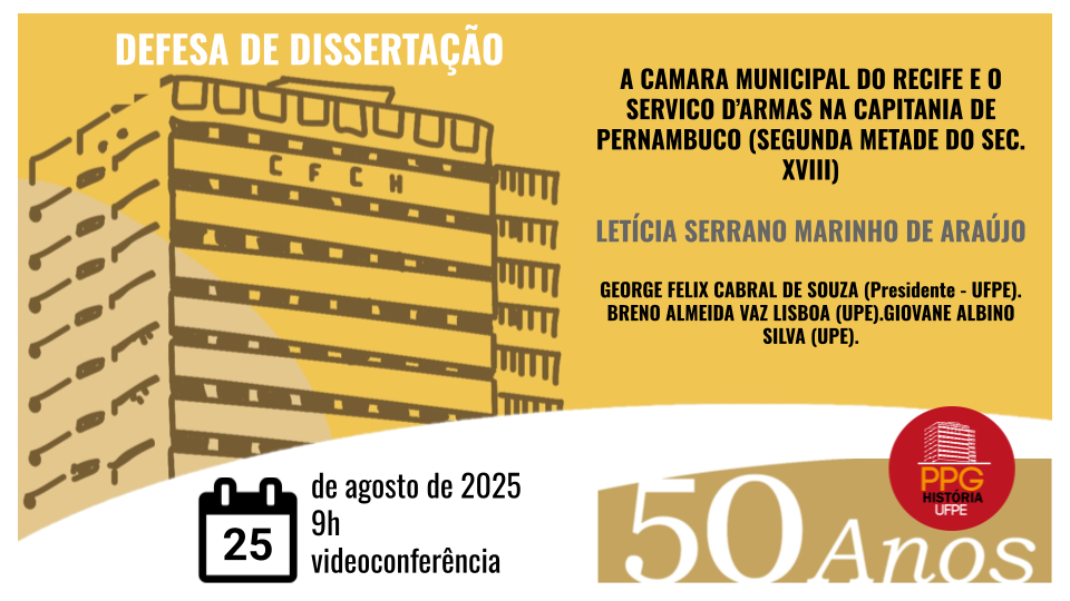 | AGOSTO | 01/08/2025 - GABRIEL DE MOURA CAVALCANTI Auditório do PPGH/UFPE (10º andar do CFCH) 06/082025 - EMERSON RODRIGO BARRETO DE ANDRADE INSCRIÇÃO (é obrigatório ter conta gmail) 06/08/2025 - VICTOR CÂNDIDO AZOUBEL ABRAM Auditório do PPGH/UFPE (10º andar do CFCH) 21/08/2025 - DAVID BEZERRA FILGUEIRA DE V. CONCERVA INSCRIÇÃO (é obrigatório ter conta gmail) 21/08/2025 - IVAN SOARES DOS SANTOS JÚNIOR INSCRIÇÃO (é obrigatório ter conta gmail) 22/08/2025 - LUÍS FERNANDO ARAÚJO FARIAS INSCRIÇÃO (é obrigatório ter conta gmail) 22/08/2025 - SÍLVIA BEZERRA DOS SANTOS INSCRIÇÃO (é obrigatório ter conta gmail) 25/08/2025 - LETÍCIA SERRANO MARINO DE ARAÚJO INSCRIÇÃO (é obrigatório ter conta gmail) 26/08/2025 - ANDERSON CORDEIRO DE MOURA INSCRIÇÃO (é obrigatório ter conta gmail) 27/08/2025 - CELSON FRANCISCO DUDA INSCRIÇÃO (é obrigatório ter conta gmail) 27/08/2025 - THIAGO HENRIQUE FARIAS PEREIRA INSCRIÇÃO (é obrigatório ter conta gmail) 28/08/2025 - JOSÉ MATEUS THOMAZ GOMES PEREIRA INSCRIÇÃO (é obrigatório ter conta gmail) 28/08/2025 - ANDERSON DA SILVA FÉLIX INSCRIÇÃO (é obrigatório ter conta gmail) 28/08/2025 - GABRIEL BANDEIRA ALEXANDRE INSCRIÇÃO (é obrigatório ter conta gmail) 28/08/2025 - RODRIGO LINS BARBOSA INSCRIÇÃO (é obrigatório ter conta gmail) 29/08/2025 - RENATA CONCEIÇÃO NÓBREGA SANTOS INSCRIÇÃO (é obrigatório ter conta gmail) 29/08/2025 - CHEYENNE DAVID DE MEDEIROS TEODOZIO INSCRIÇÃO (é obrigatório ter conta gmail) 29/08/2025 - JULYANA ALVES BARBOSA DE ARAÚJO INSCRIÇÃO (é obrigatório ter conta gmail) 29/08/2025 - ENRIQUE JOSÉ DE ANDRADE PEREIRA INSCRIÇÃO (é obrigatório ter conta gmail) 29/08/2025 - ARISTILDES MORAIS DA SILVA NETO INSCRIÇÃO (é obrigatório ter conta gmail) 29/08/2025 - ADILZA BANDEIRA DA SILVA INSCRIÇÃO (é obrigatório ter conta gmail) |