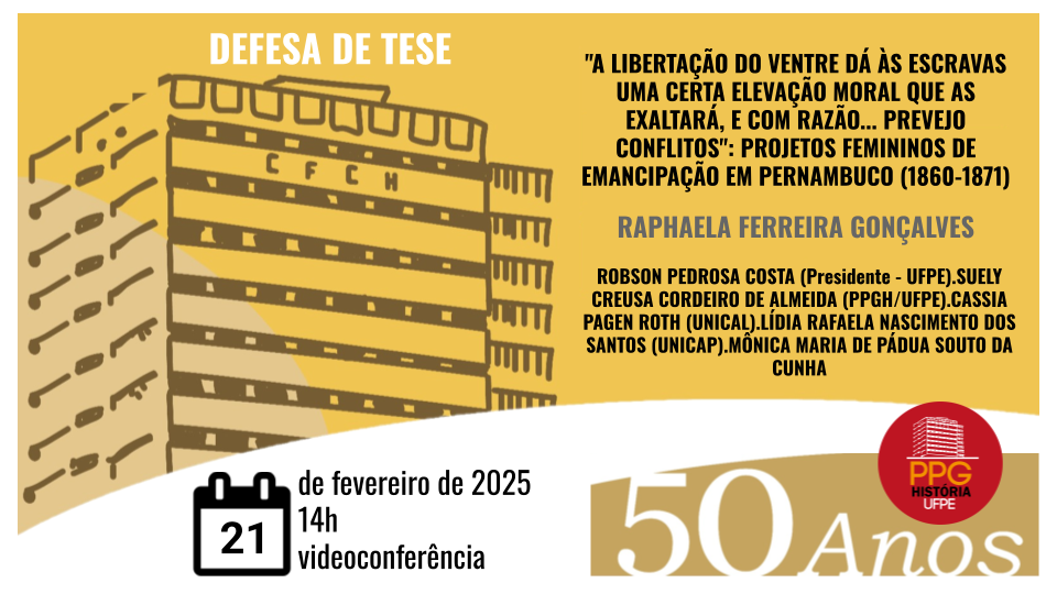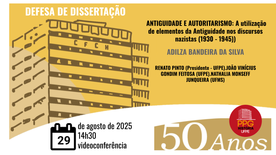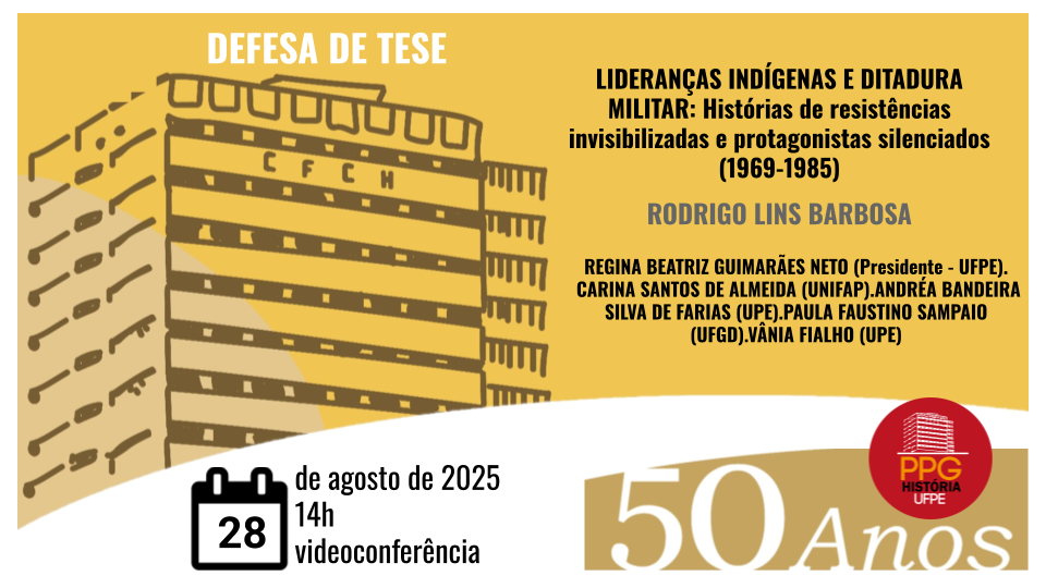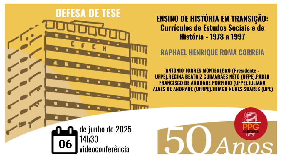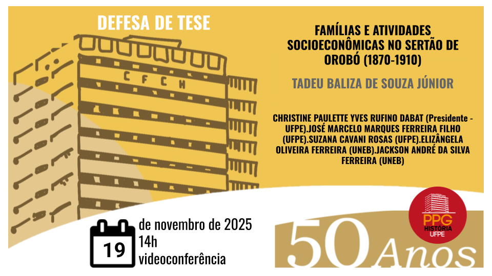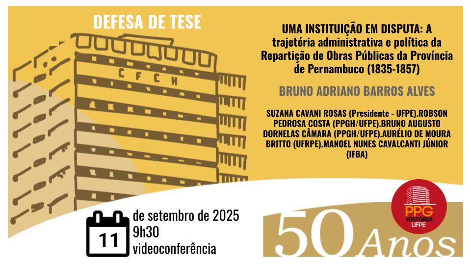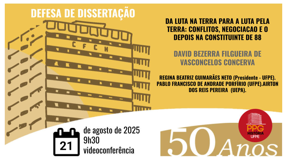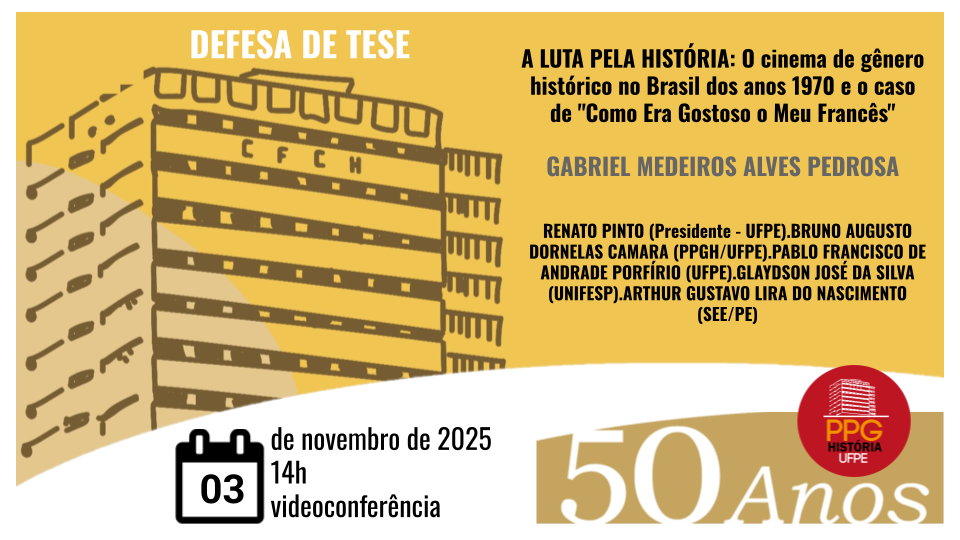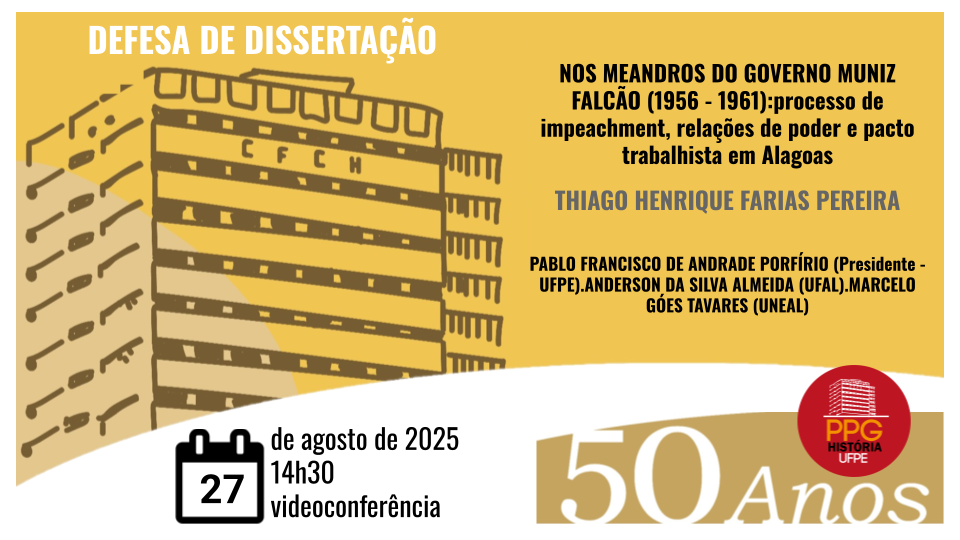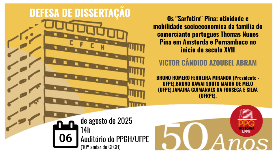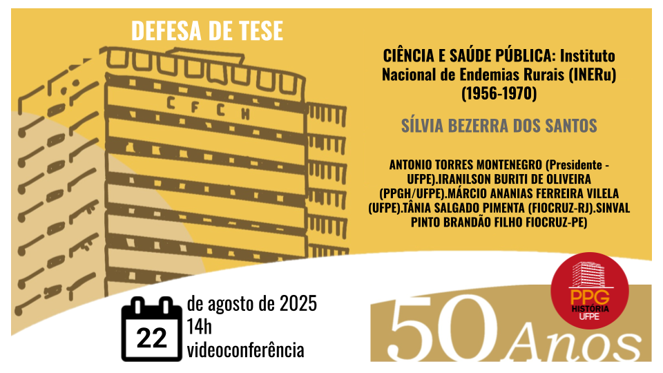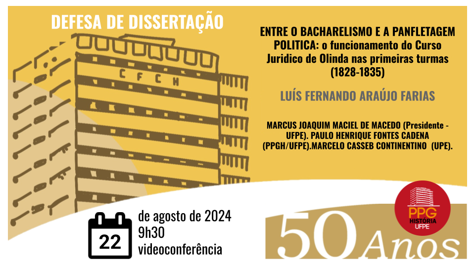 | AGOSTO | 01/08/2025 - GABRIEL DE MOURA CAVALCANTI Auditório do PPGH/UFPE (10º andar do CFCH) 06/082025 - EMERSON RODRIGO BARRETO DE ANDRADE INSCRIÇÃO (é obrigatório ter conta gmail) 06/08/2025 - VICTOR CÂNDIDO AZOUBEL ABRAM Auditório do PPGH/UFPE (10º andar do CFCH) 21/08/2025 - DAVID BEZERRA FILGUEIRA DE V. CONCERVA INSCRIÇÃO (é obrigatório ter conta gmail) 21/08/2025 - IVAN SOARES DOS SANTOS JÚNIOR INSCRIÇÃO (é obrigatório ter conta gmail) 22/08/2025 - LUÍS FERNANDO ARAÚJO FARIAS INSCRIÇÃO (é obrigatório ter conta gmail) 22/08/2025 - SÍLVIA BEZERRA DOS SANTOS INSCRIÇÃO (é obrigatório ter conta gmail) 25/08/2025 - LETÍCIA SERRANO MARINO DE ARAÚJO INSCRIÇÃO (é obrigatório ter conta gmail) 26/08/2025 - ANDERSON CORDEIRO DE MOURA INSCRIÇÃO (é obrigatório ter conta gmail) 27/08/2025 - CELSON FRANCISCO DUDA INSCRIÇÃO (é obrigatório ter conta gmail) 27/08/2025 - THIAGO HENRIQUE FARIAS PEREIRA INSCRIÇÃO (é obrigatório ter conta gmail) 28/08/2025 - JOSÉ MATEUS THOMAZ GOMES PEREIRA INSCRIÇÃO (é obrigatório ter conta gmail) 28/08/2025 - ANDERSON DA SILVA FÉLIX INSCRIÇÃO (é obrigatório ter conta gmail) 28/08/2025 - GABRIEL BANDEIRA ALEXANDRE INSCRIÇÃO (é obrigatório ter conta gmail) 28/08/2025 - RODRIGO LINS BARBOSA INSCRIÇÃO (é obrigatório ter conta gmail) 29/08/2025 - RENATA CONCEIÇÃO NÓBREGA SANTOS INSCRIÇÃO (é obrigatório ter conta gmail) 29/08/2025 - CHEYENNE DAVID DE MEDEIROS TEODOZIO INSCRIÇÃO (é obrigatório ter conta gmail) 29/08/2025 - JULYANA ALVES BARBOSA DE ARAÚJO INSCRIÇÃO (é obrigatório ter conta gmail) 29/08/2025 - ENRIQUE JOSÉ DE ANDRADE PEREIRA INSCRIÇÃO (é obrigatório ter conta gmail) 29/08/2025 - ARISTILDES MORAIS DA SILVA NETO INSCRIÇÃO (é obrigatório ter conta gmail) 29/08/2025 - ADILZA BANDEIRA DA SILVA INSCRIÇÃO (é obrigatório ter conta gmail) |