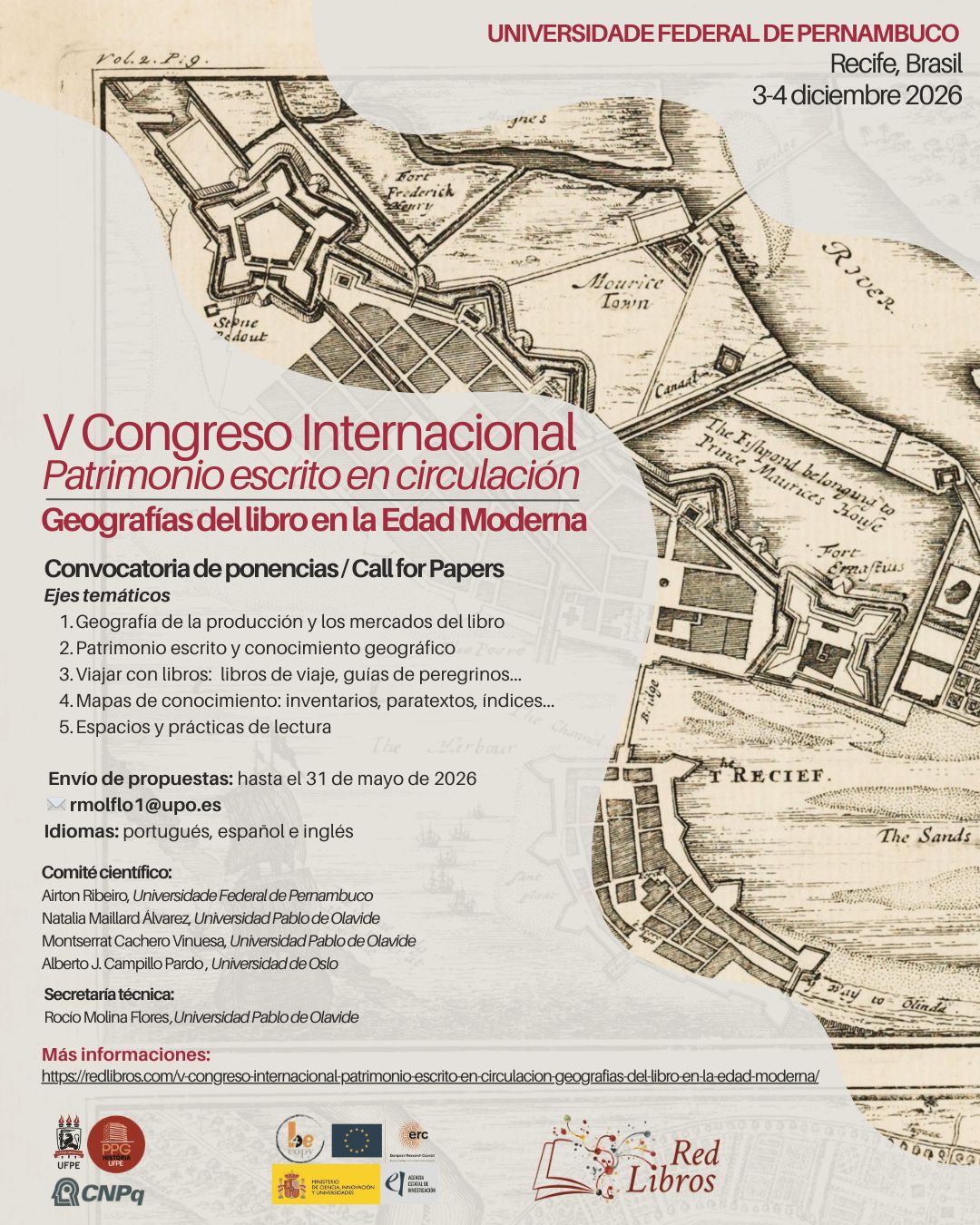 Temos a satisfação de anunciar o V Congresso Internacional Patrimônio Escrito em Circulação, cujo tema em 2026 será Geografias do Livro na Idade Moderna. O congresso é fruto de uma rede transatlântica de pesquisadores dedicados à história do livro, da cultura escrita e da circulação do conhecimento. As edições anteriores foram realizadas em Sevilha, Roma e Bogotá, e agora o encontro acontecerá na Universidade Federal de Pernambuco, em Recife (Brasil), nos dias 3 e 4 de dezembro de 2026.