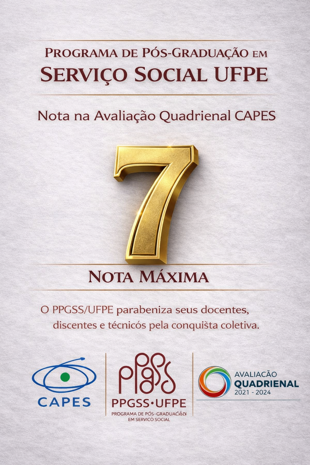 O Programa de Pós-Graduação em Serviço Social da Universidade Federal de Pernambuco (PPGSS/UFPE) obteve Nota 7 na Avaliação Quadrienal 2021–2024 da CAPES, alcançando a pontuação máxima atribuída aos programas de pós-graduação no Brasil.