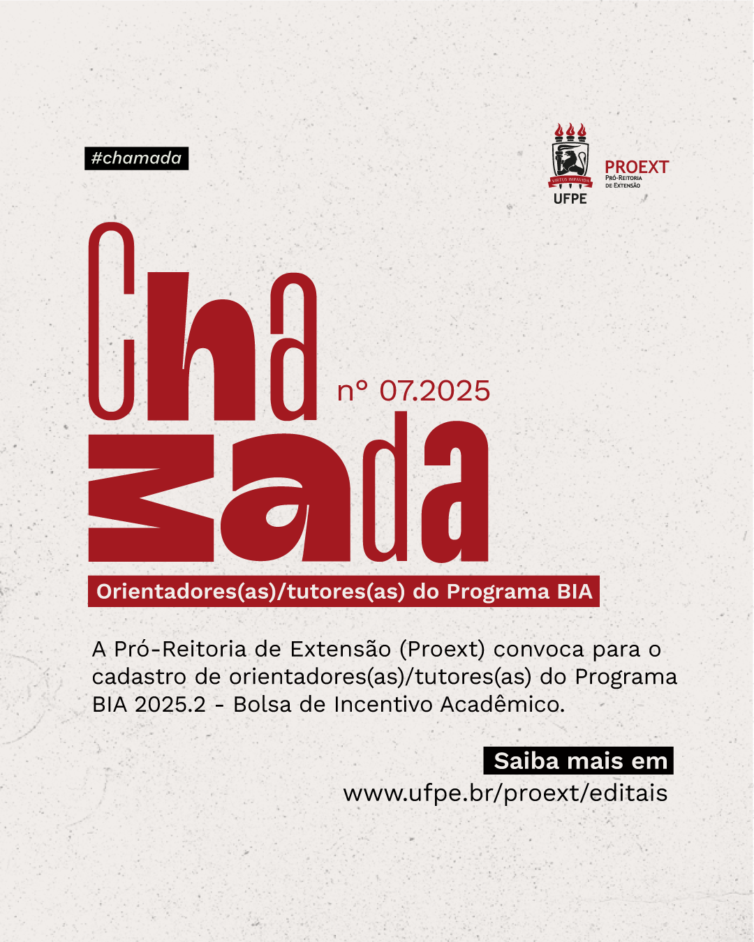 A Pró-Reitoria de Extensão (Proext) da Universidade Federal de Pernambuco (UFPE) lançou a Chamada Pública Interna Proext 07/2025 para o cadastro de docentes e pós-doutorandos interessados em atuar como orientadores(as)/tutores(as) dos bolsistas do Programa de Bolsa de Incentivo Acadêmico (BIA) no semestre letivo 2025.2. A chamada detalha requisitos, atribuições, benefícios e o procedimento de inscrição para compor o Banco de Orientadores(as)/Tutores(as) BIA-UFPE 2025.2.