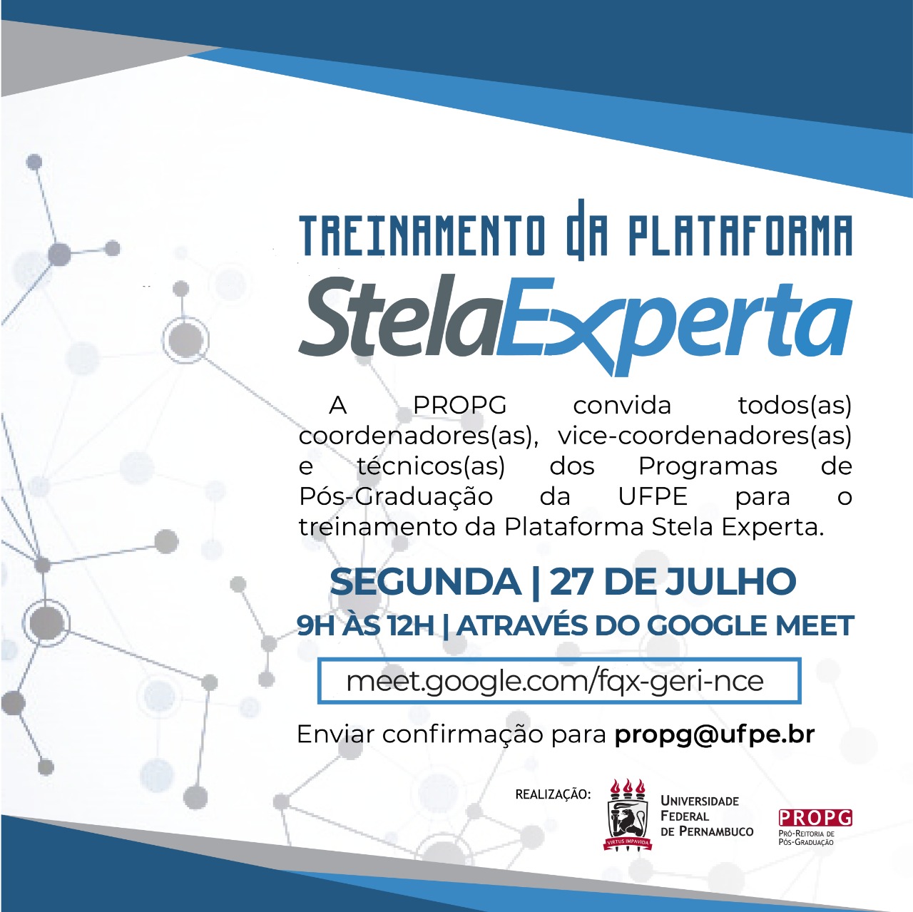 A Pró-reitoria de Pós-Graduação (PROPG) realiza na próxima segunda-feira (27) um treinamento da Plataforma Stela Experta. São convidados a participar todos os(as) coordenadores(as), vice-coordenadores(as) e técnicos(as) dos Programas de Pós-graduação (PPGs).