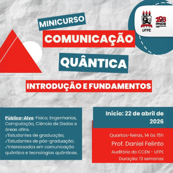 Devido à grande procura, o Instituto de Tecnologias Quânticas (Quanta) da UFPE anuncia a nova data e local de realização do minicurso gratuito “Comunicação quântica - Introdução e fundamentos”, com o professor Daniel Felinto, do Departamento de Física. A formação tem início agora no dia 22 de abril, no Auditório Professor Ricardo Ferreira, no Centro de Ciências Exatas e da Natureza (CCEN). Os encontros serão realizados sempre às quartas-feiras, das 14h às 15h. As inscrições continuam abertas e devem ser feitas por meio deste link.