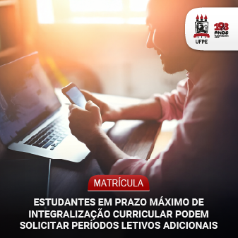 A Pró-Reitoria de Graduação (Prograd) informa que os estudantes da UFPE incursos no art. 1º da Resolução nº 07/2021-CEPE/UFPE, isto é, que esgotarão, em 2026.1, o prazo máximo estabelecido para integralização do perfil curricular a que se encontrem vinculados, poderão solicitar períodos letivos adicionais à Comissão de Recusa, por meio de recurso administrativo instruído junto à Coordenação do Curso. O prazo para realizar esse procedimento é de 10 a 23 de março.