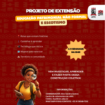 Estão abertas as inscrições para o projeto de extensão “Educação patrimonial, turismo e escotismo”, iniciativa que envolve discentes de graduação e pós-graduação da Universidade Federal de Pernambuco (UFPE) com foco na valorização de memórias e patrimônios afro-brasileiros e indígenas em contextos urbanos e rurais. Coordenado pelo professor Alex Sandro Gomes, do Centro de Informática (CIn), o projeto prevê o desenvolvimento de rotas geolocalizadas com conteúdos multimídia, além da realização de atividades educativas em parceria com grupos escoteiros.